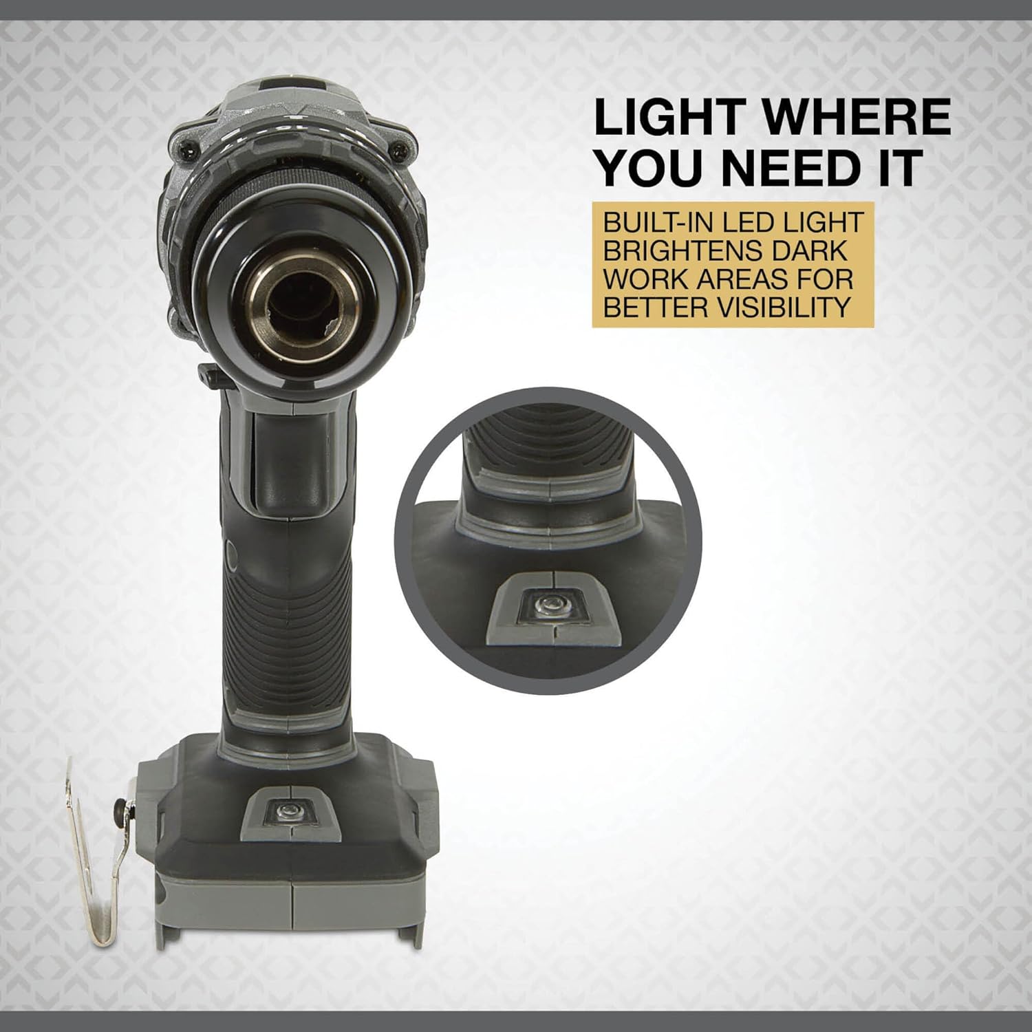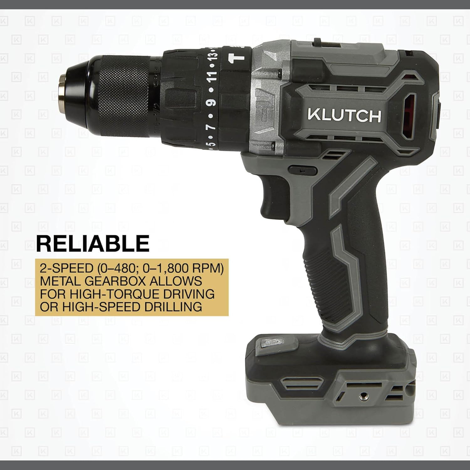 The Klutch Hammer Drill/Driver provides cordless power and performance for any job. Brushless motor technology extends motor life 10x, while providing up to 60% more run time, and reduces heat buildup. The 2-speed gearbox with up to 1,800 RPM and breakaway torque of 440 in./lbs. provide reliability in various applications. A built-in LED worklight helps illuminate the work area. This hammer drill/driver uses high-performance Klutch KLiQ 20V Lithium-Ion Batteries (sold separately), designed to work with all Klutch KLiQ 20V power tools. With advanced technology, durable, chemical-resistant housings and convenient battery fuel gauges, Klutch KLiQ Lithium-Ion Batteries are your total power solution.
