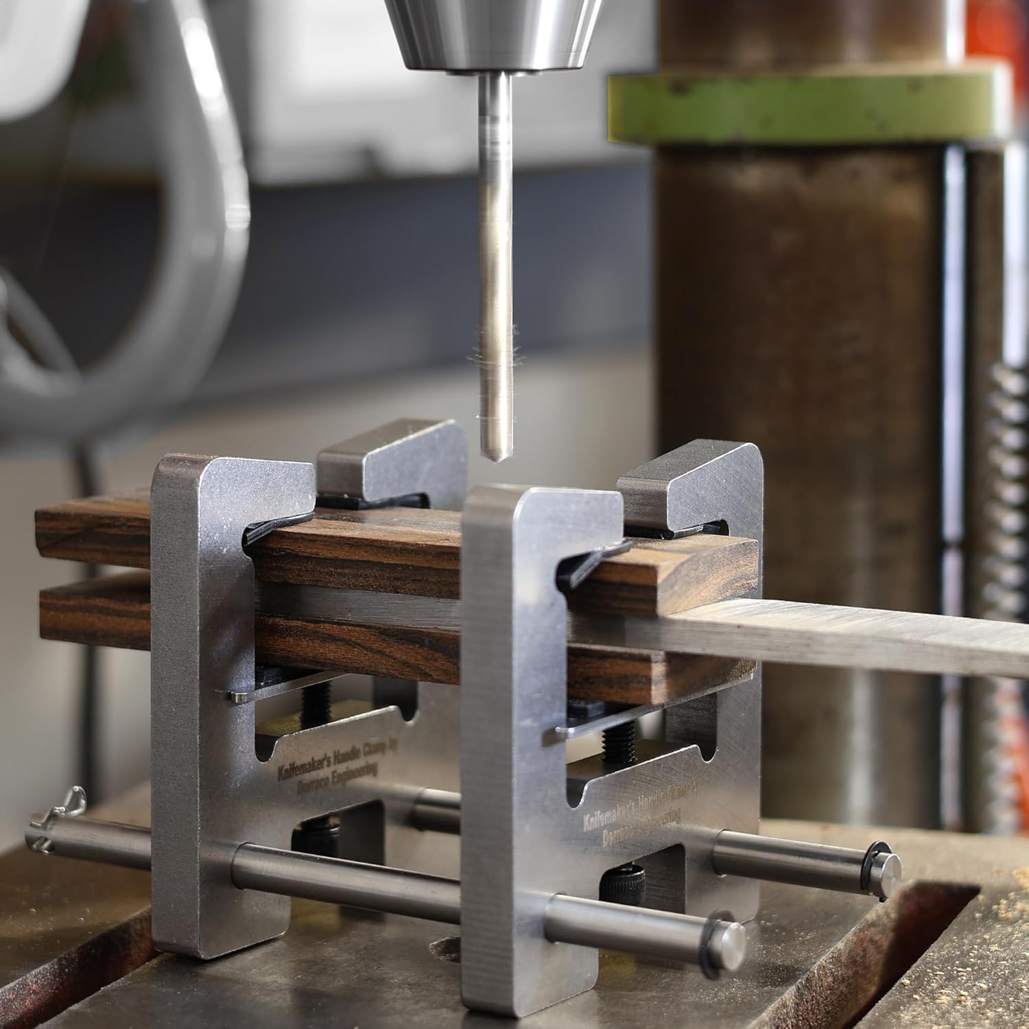 Elevate your knifemaking craft with these professional-grade Handle Drill Clamps by Derraco Engineering. Precision-engineered from durable 420 stainless steel, these clamps are essential tools for achieving perfectly aligned pinholes in knife handles. The set includes two robust drill clamps with guide rails, ensuring consistent and accurate results every time. Each clamp comes with four different length screws for versatile material handling, while the included rubber strips protect your handle materials during work. The thoughtfully designed clamping mechanism provides stable, secure grip for both beginners and experienced craftsmen. Perfect for custom knife makers, these clamps streamline the handle-making process by maintaining precise alignment throughout drilling operations. The complete kit includes an Allen key for easy adjustments, making it a comprehensive solution for professional knife handle construction. These clamps represent the perfect blend of durability, precision, and practical functionality for your workshop needs.