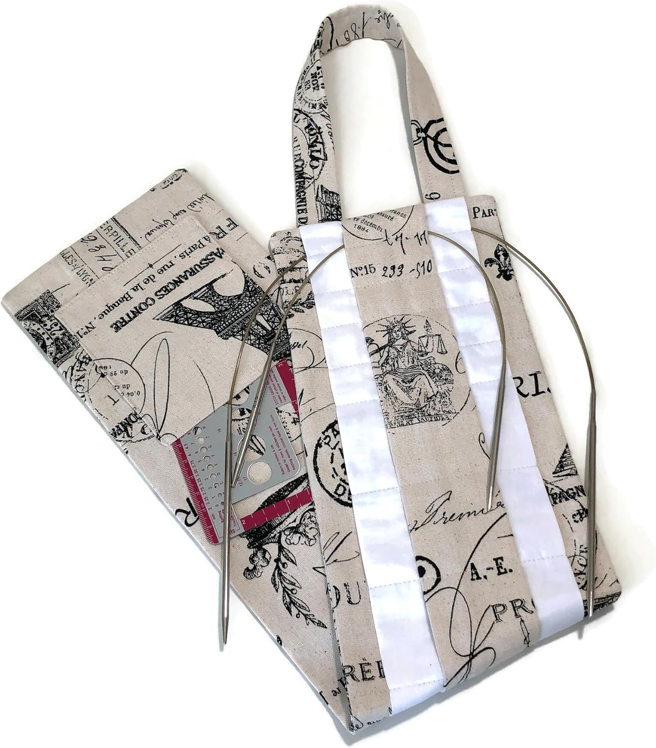 This knitting needle hanging organizer is the perfect solution for keeping your circular knitting needles organized and easily accessible. Crafted from a contemporary toile fabric showing classic French icons in black on an off white back ground. With a total of 30 slots, you can neatly store your needles by size, ensuring they're always within reach. The hanging design enables you to hang it in your workspace or a closet. There is a 4x4.5-inch pocket on the backside, giving you a handy space to stowe your needle gauge.