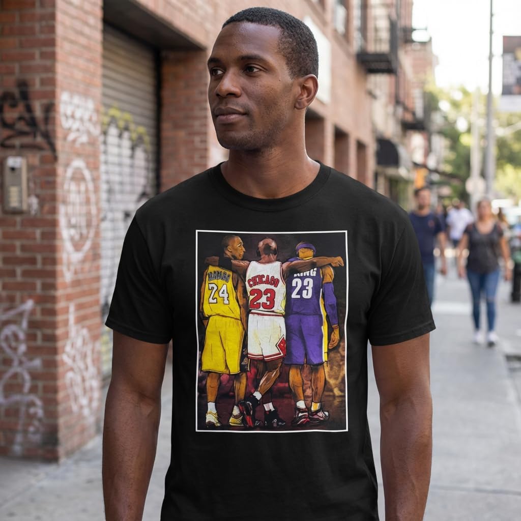 This tee celebrates the timeless legacy of three generational hoop icons linking eras from Los Angeles to Chicago and beyond. Featuring Kobe in classic gold and purple representing the Mamba mentality, Michael in the unmistakable Chicago red embodying clutch greatness, and LeBron in his King persona carrying the modern game, this design unites the spirit of the top players ever to step on the hardwood. The artwork captures the energy of packed arenas from Staples to the United Center, the grit of late-game battles, and the respect shared by legends who defined entire eras of basketball culture. Crafted for fans who live for fast breaks, fadeaways, and fourth-quarter takeovers, this shirt is a tribute to all-time greatness and the cities that shaped it. Whether you grew up watching highlight reels, streetball runs, or championship parades, this piece brings together the heart of the game and the icons who set the standard for excellence.