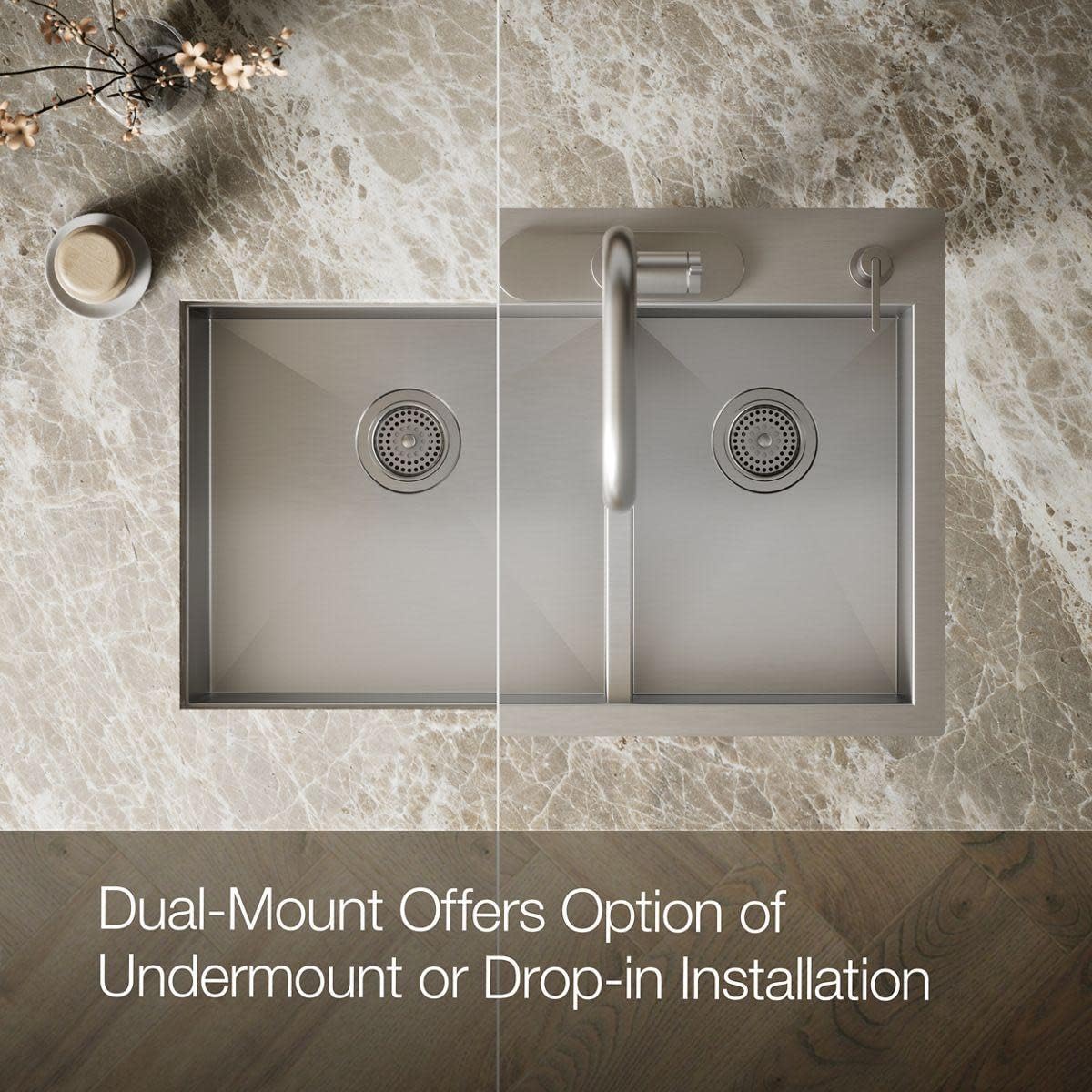 Product Description The distinctive, modern design of the KOHLER® Vault top-/undermount sink lends a contemporary vibe to your kitchen. Handcrafted from durable stainless steel, the large/medium bowls of this double bowl kitchen sink allows you to keep clean and dirty dishes separate while offering plenty of room for oversized pots and pans. The 33" under-/top mount kitchen sink features tightly angled corners to maximize bowl space and a sloped bottom that helps with draining and cleanup. Four faucet holes provide room for a kitchen sink faucet. This KOHLER® kitchen sink has a slightly lowered divide between the bowls that helps prevent water from flowing into the countertop. From the Manufacturer The new Vault sinks are dual-mount sinks that can also be used in a replacement application. The contemporary self-rimming Vault fabricated sink will appeal to customers who want a significantly differentiated sink without having to replace their countertops. The low-profile 1-1/2-mm rim provides an undercounter or flush mount aesthetic, and makes wiping debris from the countertop directly into the sink basin easier than a typical self-rimming sink, 9-Inch depths and tight corner radii maximize usable basin space, and the lowered saddle prevents water from overflowing into the countertop.