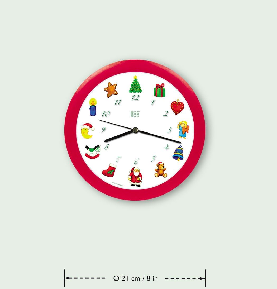A clock for cosy winters and the Christmas season. As the days grow colder and we snuggle in for cosy evenings, the scent of gingerbread and cinnamon fills the air, and children’s eyes shine with anticipation – Christmas must be right around the corner. And we have a special clock for this special time of year: KOOKOO SilentNight. This adorable wall clock with its red frame helps the time fly by until the long-awaited day. As children count down the hours until Santa stops by, this clock also gives them a fun way to practice telling the time. Next to each number on the clockface you’ll find a charming Christmas motif by children’s book illustrator Monika Neubacher-Fesser – a colourfully wrapped present next to the 1, a Christmas angel next to the 3, St. Nicolaus next to the 6, and so on. Who wouldn’t want to know what time it is when the hand points to each picture? This wall clock is like a musical Advent calendar, with a popular Christmas carol hidden behind each festive image. Every hour you’ll hear 20 seconds of magical harp music, a carol to fill you with the warmth of Christmas spirit. When darkness falls, a built-in light sensor means it’s truly time for a silent night, with the children nestled snugly in their beds. The Christmas clock comes with a booklet of sheet music and lyrics for the twelve carols so your family can sing and play along. There’s also a colouring page featuring festive Christmas illustrations to copy or colour in. Merry Christmas! Twelve Christmas carols: O Christmas Tree – Silent Night – Joy to the World – Lo, how a Rose e'er Blooming – Adeste Fideles – Good Christian Men, Rejoice – O du fröhliche – Ring, Little Bell – Schneeflöckchen, Weißröckchen – Hark! The Herald Angels Sing – Once in Royal David's City – In the Bleak Midwinter