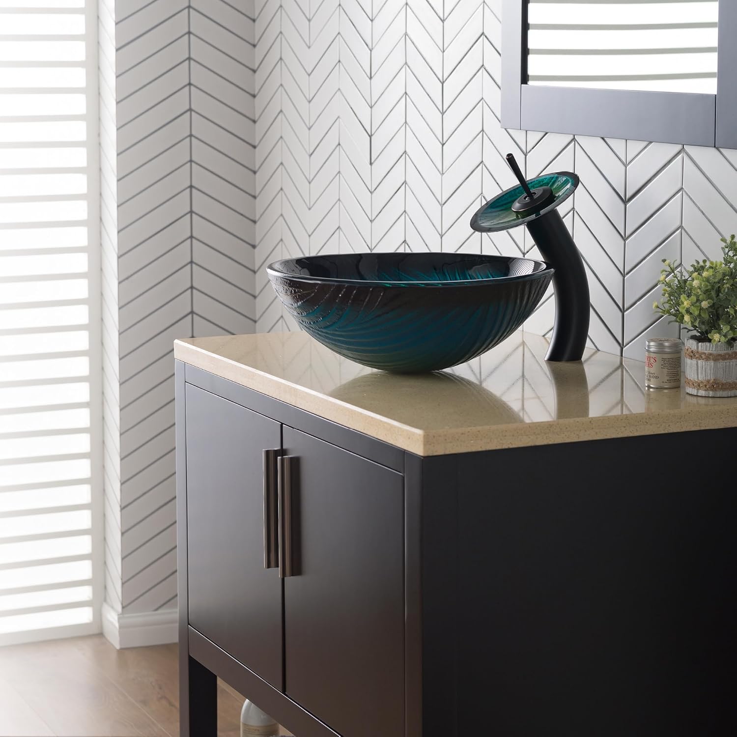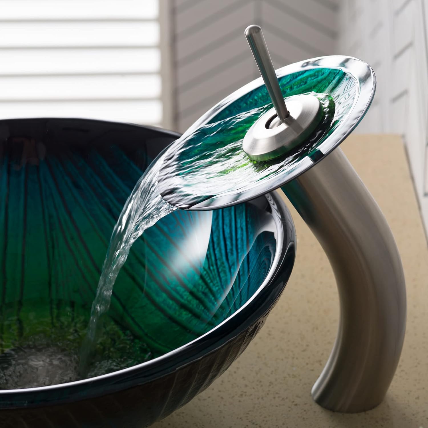 Product Description Upgrade your bathroom with a KRAUS vessel sink and faucet combo. The glass vessel sink pairs perfectly with the beautiful waterfall faucet, creating a striking centerpiece that complements any bathroom décor. Comes in a range of colors for a look that’s uniquely yours From the Manufacturer Inspired by the lush green palette of a rolling hillside, the Nei sink looks striking in a monochromatic setting or a clean, modern space. For a beautiful and eye-catching combination, add a matching glass waterfall faucet to complete the look