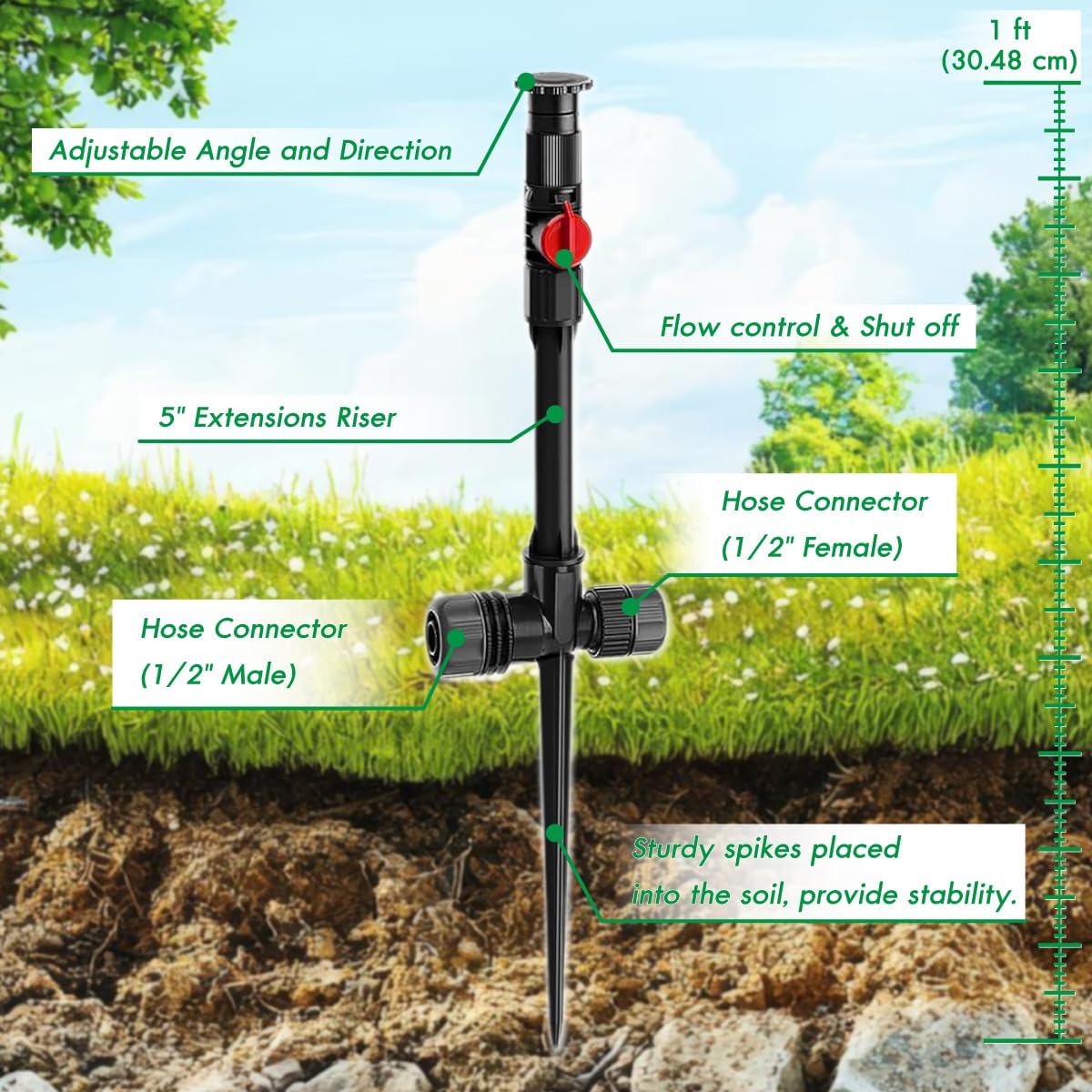 • COMPLETE DIY SPRINKLER SET – Includes (3) adjustable sprinkler heads, (3) 5" riser extensions, (1) 32 ft hose (½" diameter), (1) 3-way hose connector, (1) faucet connector (for water tap), (4) hose connectors, and (1) hose repair connector.