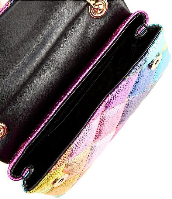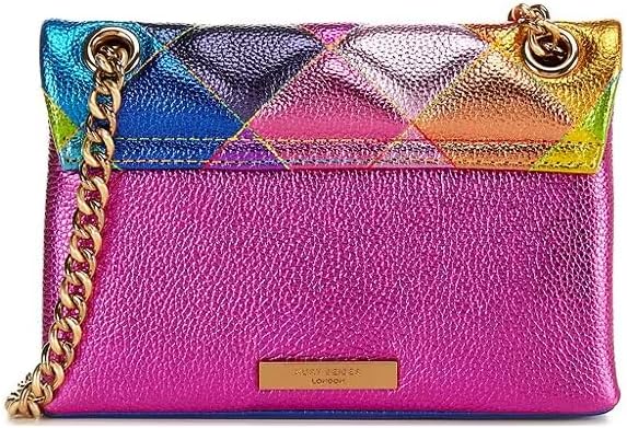 The Mini Leather Kensington Purse is crafted from a pebble grain leather in a multi-colour design resembling the glass panels in our flagship store. The gold eagle head features rainbow crystals and crystal eyes on the front flap. 5.5in (H), 7.9in (L), 2.4in (D) Strap drop cross body: 47.2in Strap drop shoulder: 30.3in Brushed gold and gold metal chain strap Duo magnetic snap closure hidden under flap Gold branded plate on the back Can fit phones up to 7 inches Small internal lining pocket Outer: Leather Interior: Monogrammed interior lining