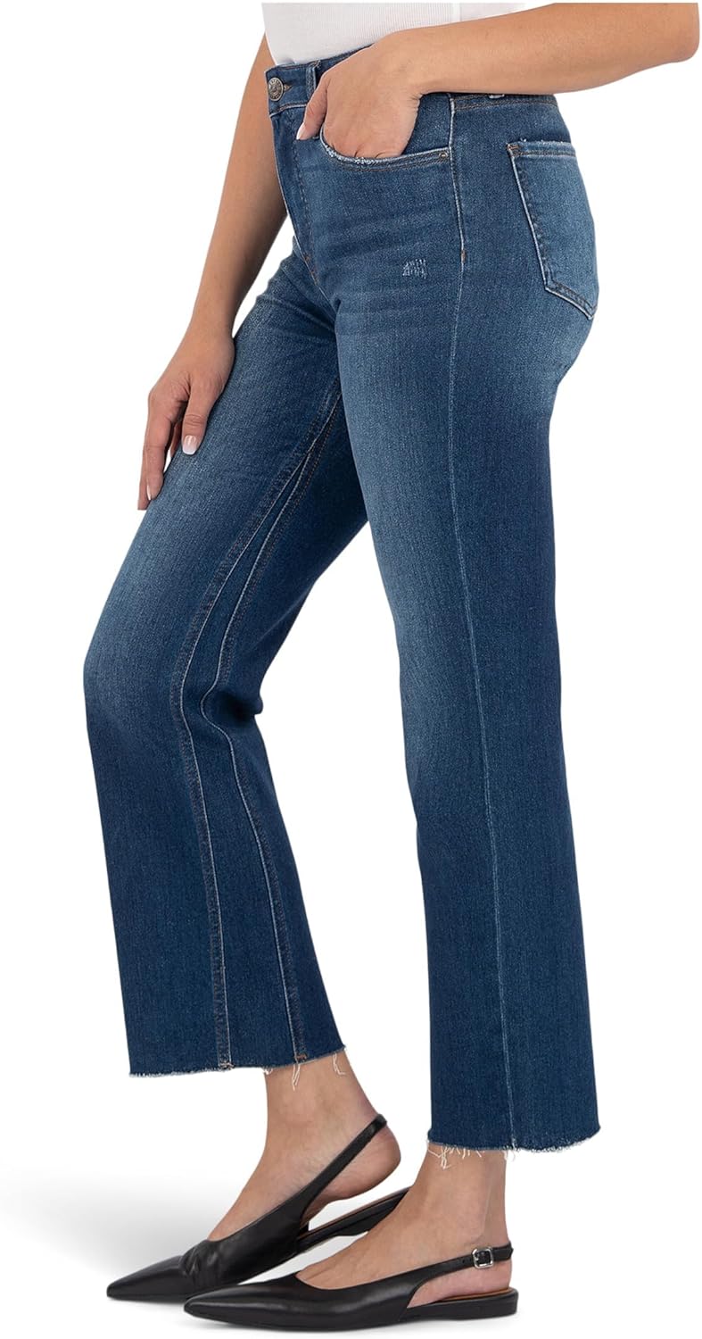 Laid-back with the perfect amount of edge, the kelsey is cropped with just the right amount of flare. The Kelsey is fitted through the hips and thighs and finishes off with a cropped kick flare for a modern take on the silhouette. Button front with a zip-fly closure. Belt loop waist. Classic five-pocket design. Contrast topstitching with metal hardware. Raw hem. 89% cotton, 10% polyester, 1% spandex. Machine wash.