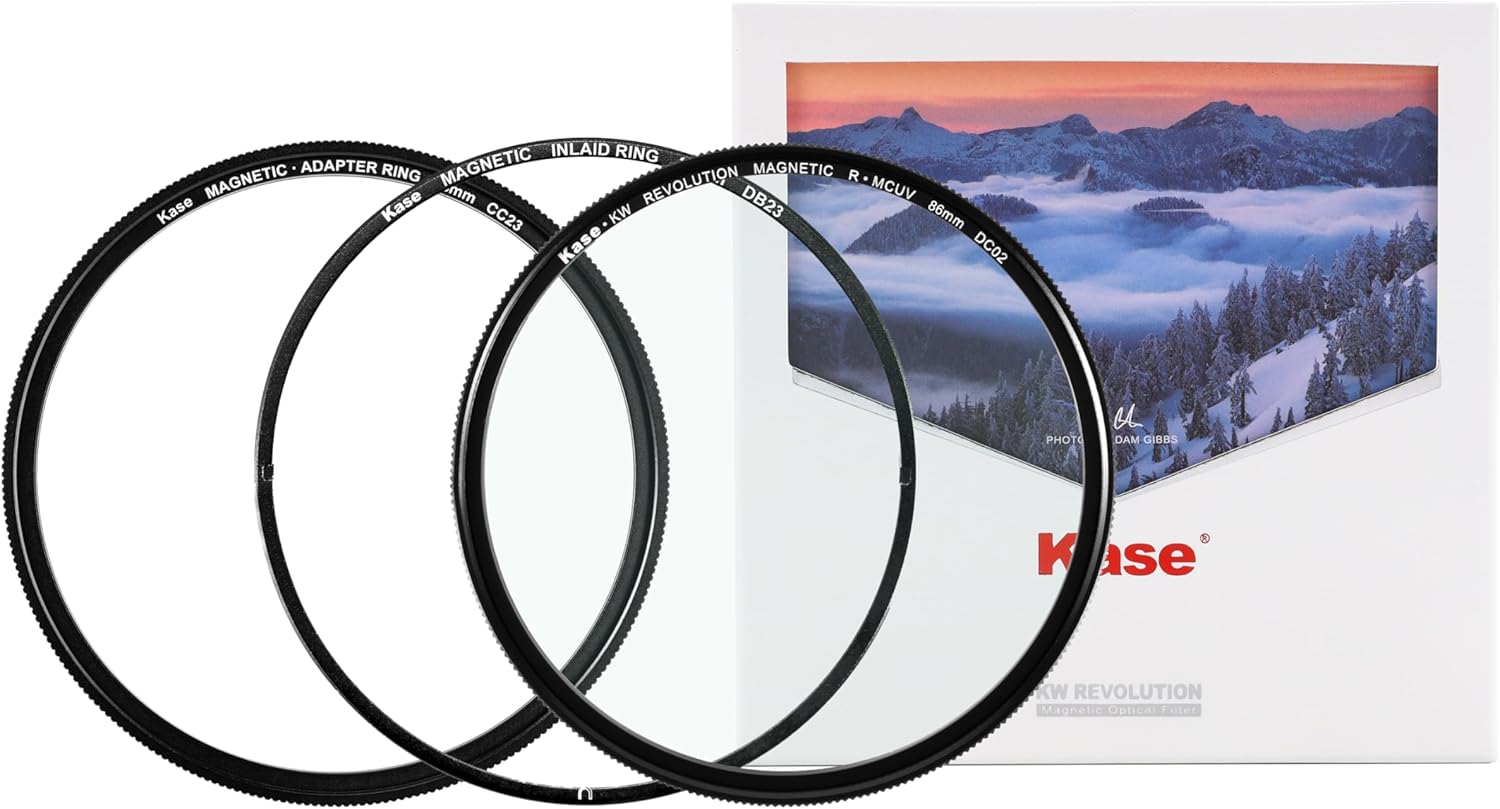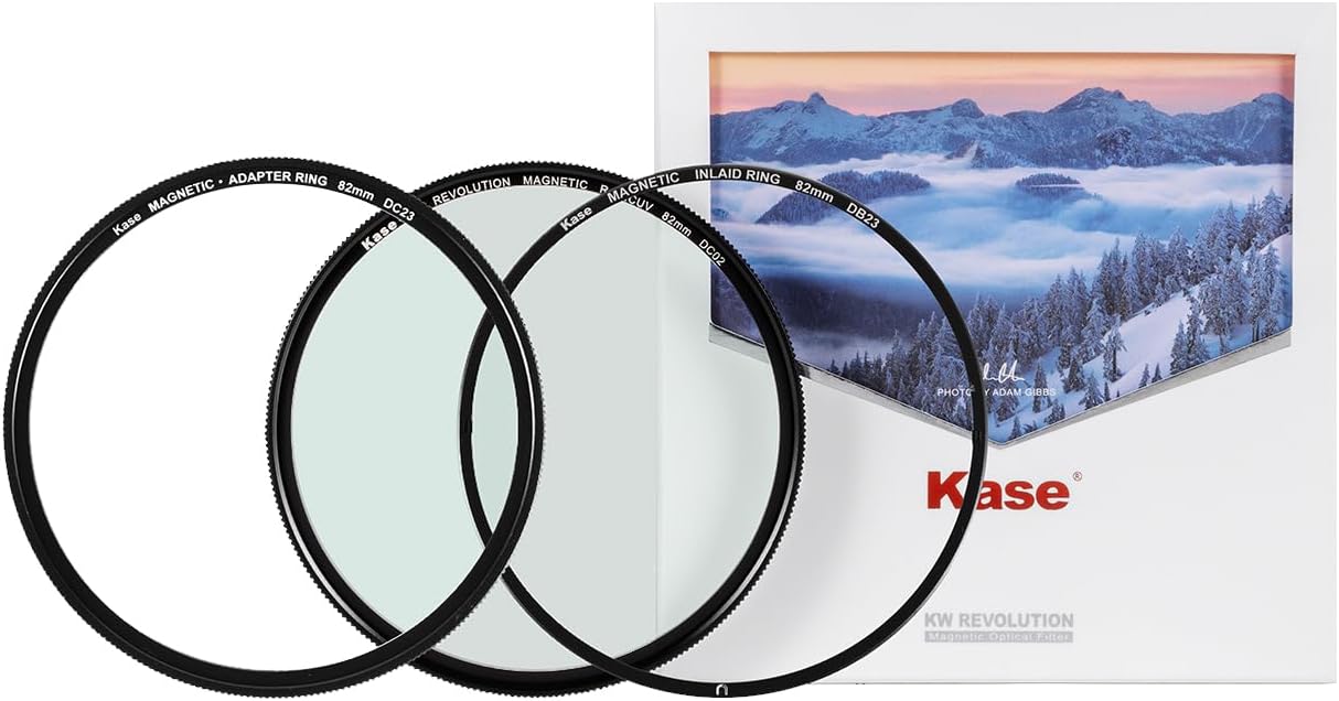 The Revolution MCUV Magnetic Filter with Two Adapters from Kase offers a flexible system to help reduce reflections, glare, and flaring in your images with minimal color cast. The multi-coated optical glass filter helps protect your images from unwanted effects and is shockproof as well as water, oil, dust, fingerprint, and scratch-resistant to help ensure long lasting quality. The standard magnetic adapter ring makes it easy to switch filters in and out once attached, while the inlaid magnetic adapter ring offers the same convenience with the added benefit of limiting vignetting in your images by reducing the distance between the filter and lens.