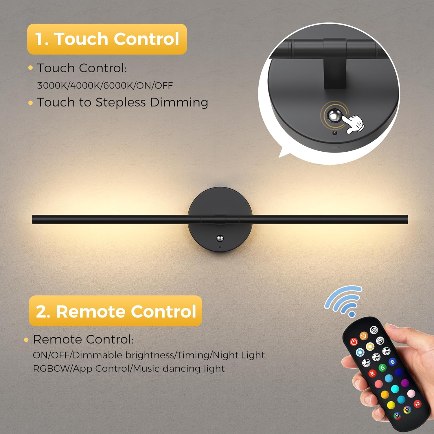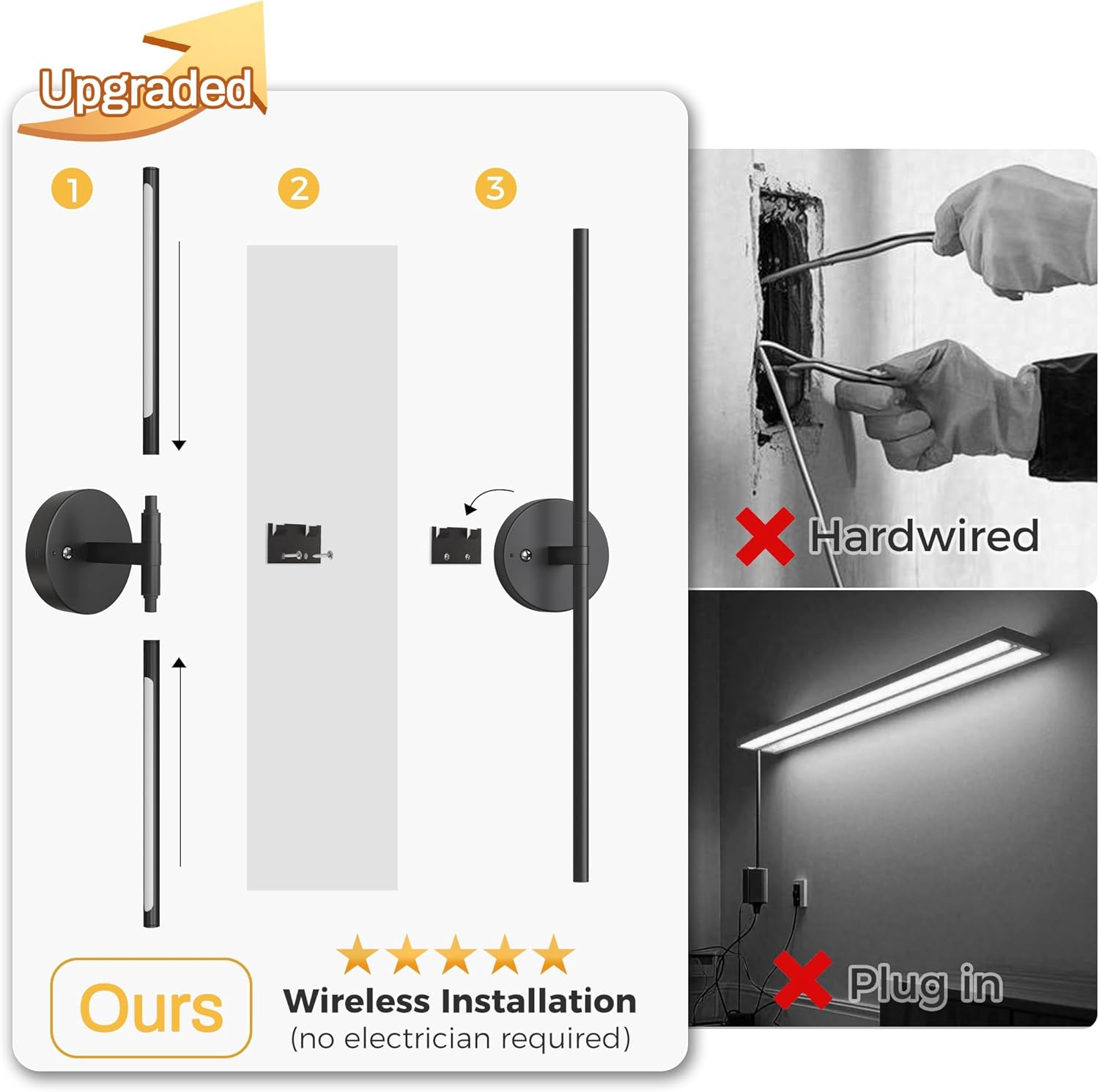 Illuminate Your Space Effortlessly:This modern battery-operated wall sconce delivers adjustable 10 color lighting (CRI 85+) with a rust-resistant matte black finish. The 360° rotatable tube lets you direct brilliant, eye-friendly illumination exactly where needed. Featuring a massive 10,000mAh rechargeable battery (25-50 hours runtime), this wireless powerhouse eliminates electrician costs and messy wiring—simply mount the base, rotate the lamp into the socket via DIY installation, and recharge via USB. Control brightness your way: use the included remote for seamless 0-100% dimmingor tap the built-in step-dimming buttons for quick adjustments. The crack-resistant acrylic shade diffuses glare-free light while enhancing safety. Choose from Black, Gold, Black-Gold, or Brushed Nickel finishes to match farmhouse, modern, or industrial decors—perfect as bedside reading lamps, staircase safety lights, artwork accents, or closet task lighting. Backed by our robust 36-month warranty, we guarantee defect-free performance with 24-hour response via Amazon Buyer-Seller Messaging.