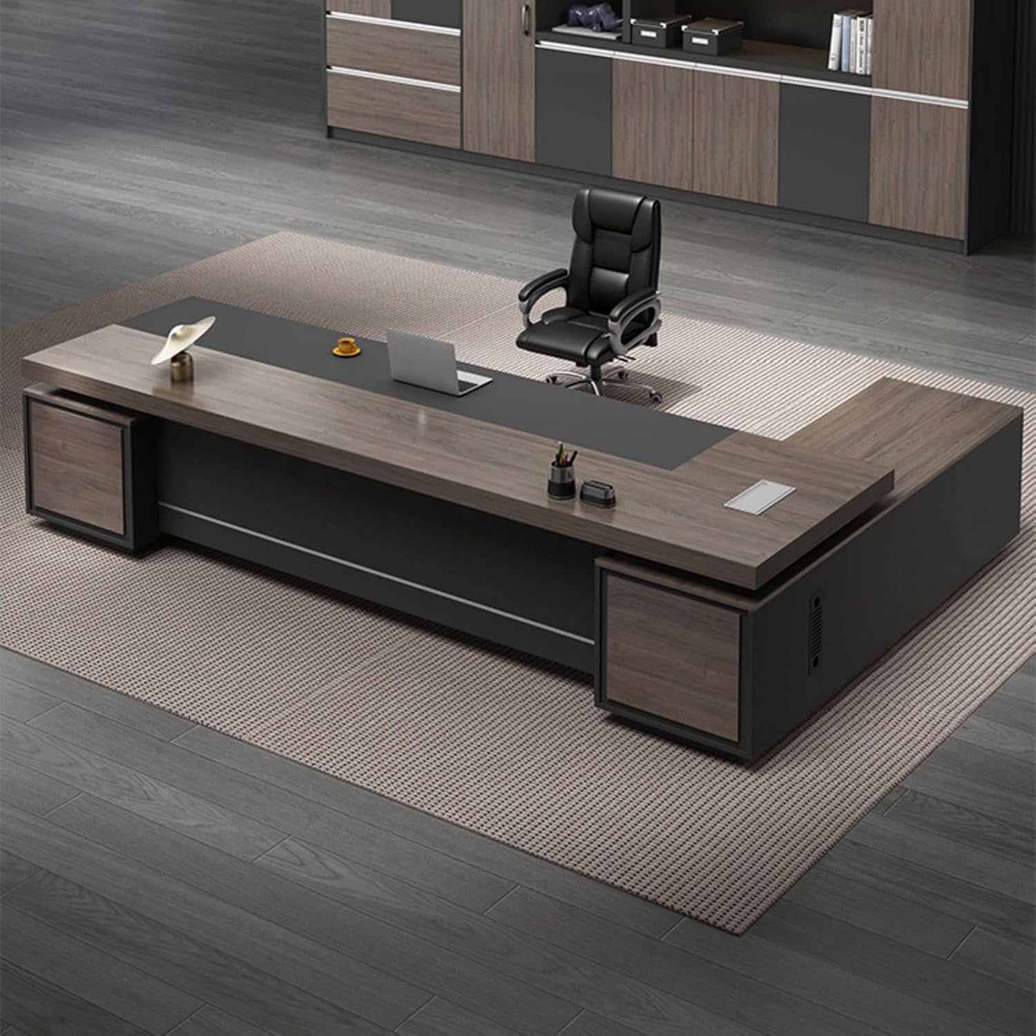 Product Dimensions: 94"L x 63" W x 29.5"HColor: BrownStyle: ModernBase Material: Wooden LegsTop Material Type: WoodFinish Type: WoodSpecial Feature: L-ShapedRoom Type: Office, Bedroom, Study RoomRecommended Uses for Product: WorkingPackage List:Executive Desk x1Installation Accessories x1