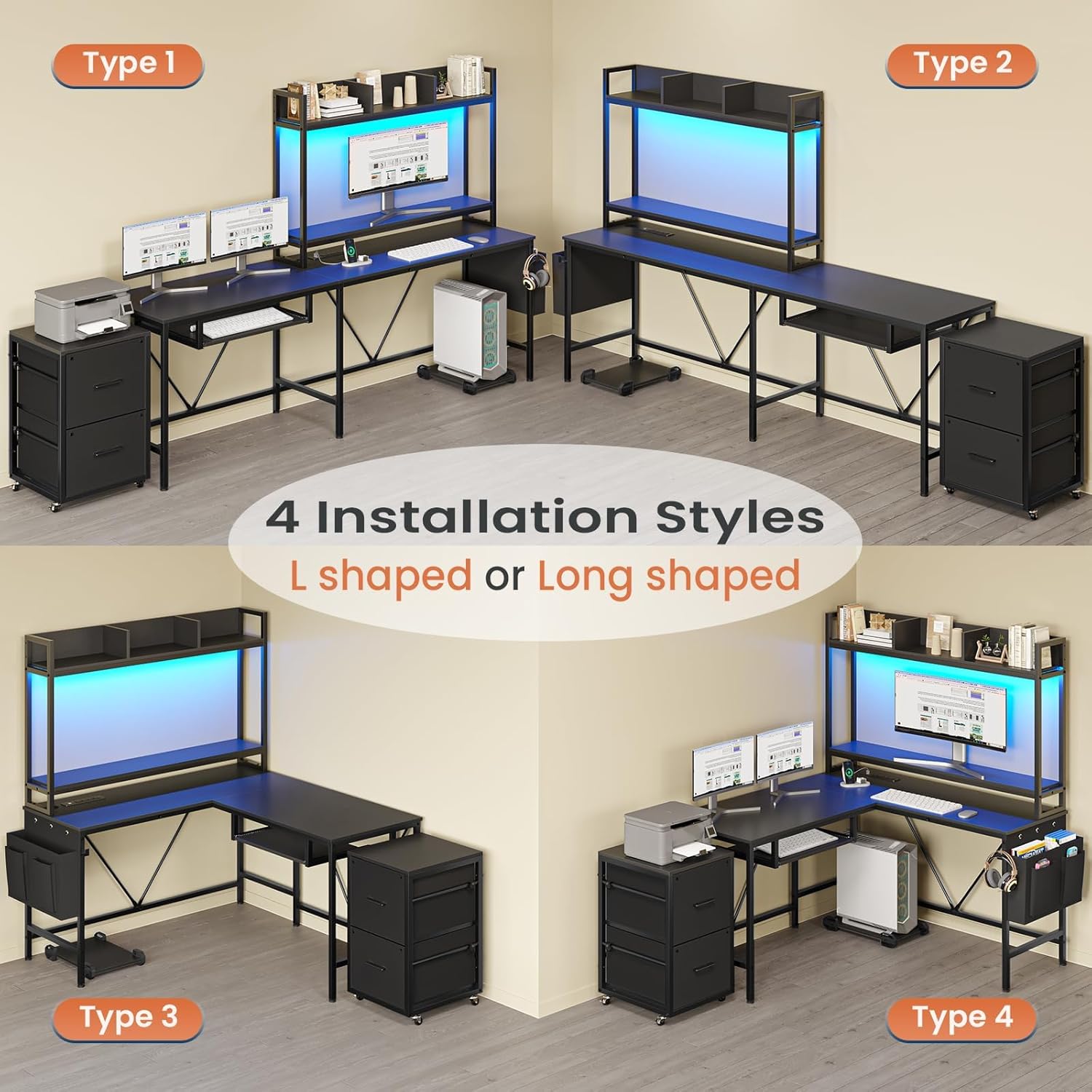 Specification:Color: Brown/Black/WhiteL Shaped Dimension: 46.4"D x 55.2"W x 60.2"HLong Shaped Dimension: 19.7"D x 83"W x 60.2"HMaterial: Metal, Engineered WoodRecommend Max Load Capacity: 77lbPackage includes:1 x Computer desk1 x Mobile filing cabinet1 x Storage bag1 x CPU stand1 x LED strips1 x Headphone hook1 x Assemble kit1 x InstructionWarm tips:1. Please refer to the accessory labels and instructions for installation. If there are any installation issues, missing accessories, or product issues, please contact us promptly.2. Children are not allowed to climb or play on the product for safety reasons.3. The max static load capacity of the bench is 77lb. Please do not exceed its weight limit.
