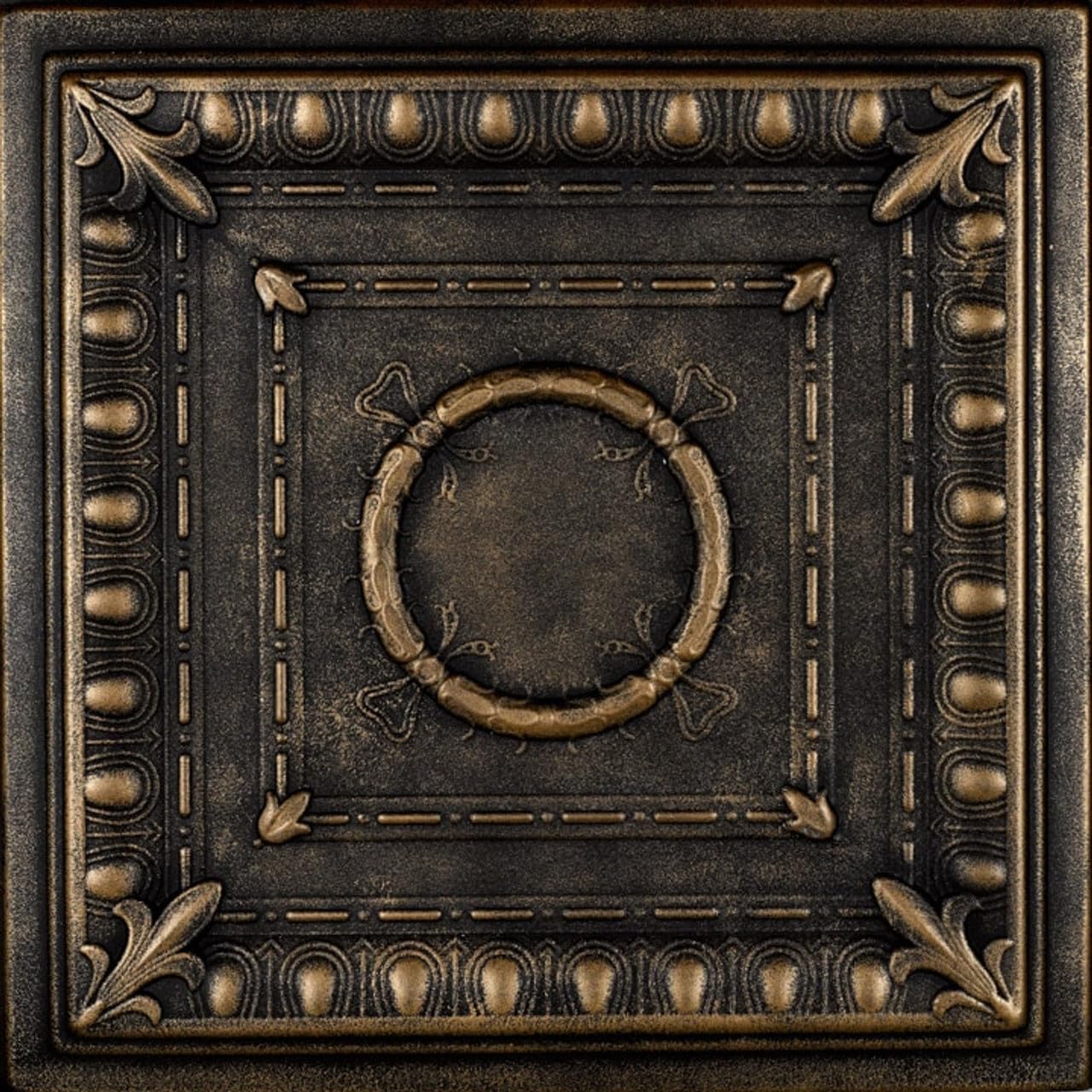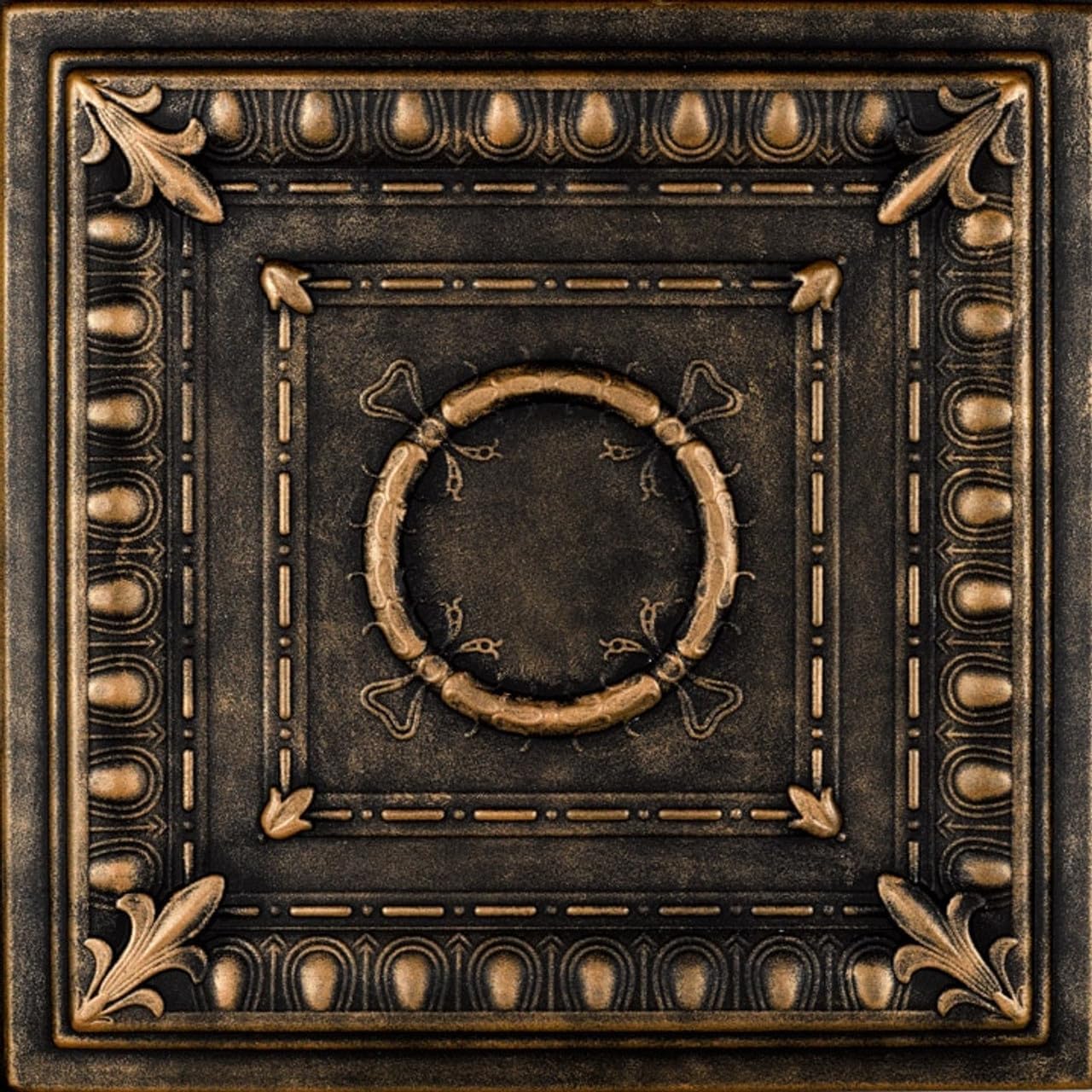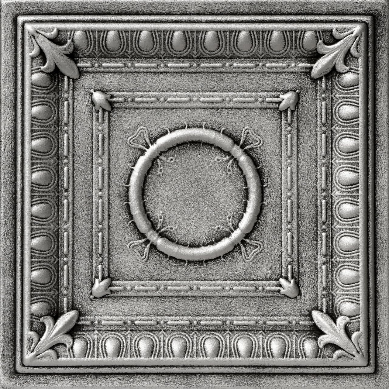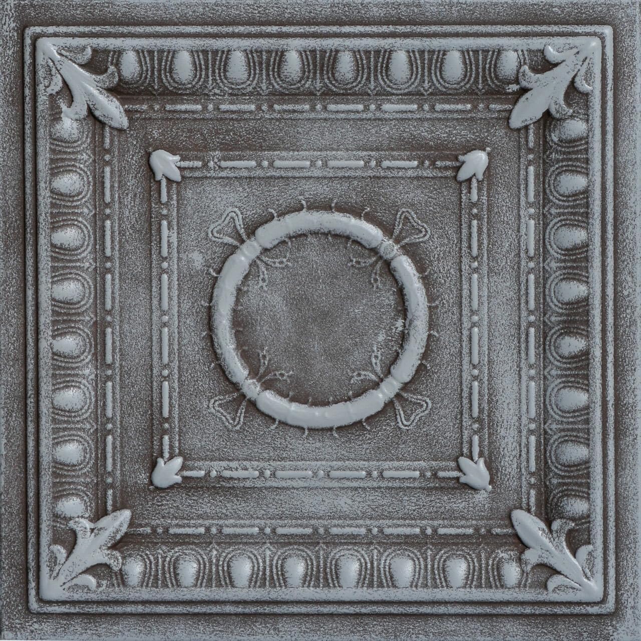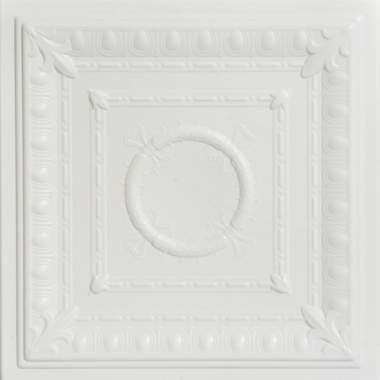 Bring a touch of Roman grandeur to your home with the R47 Romanesque Wreath ceiling tile! These styrofoam tiles boast a timeless design featuring a perfectly round central wreath framed by symmetrical squares. One square showcases bold lines, while the other features a delicate floral pattern. The R47 adds a sense of strength, stability, and classic beauty to any room, making it a surefire hit for years to come.