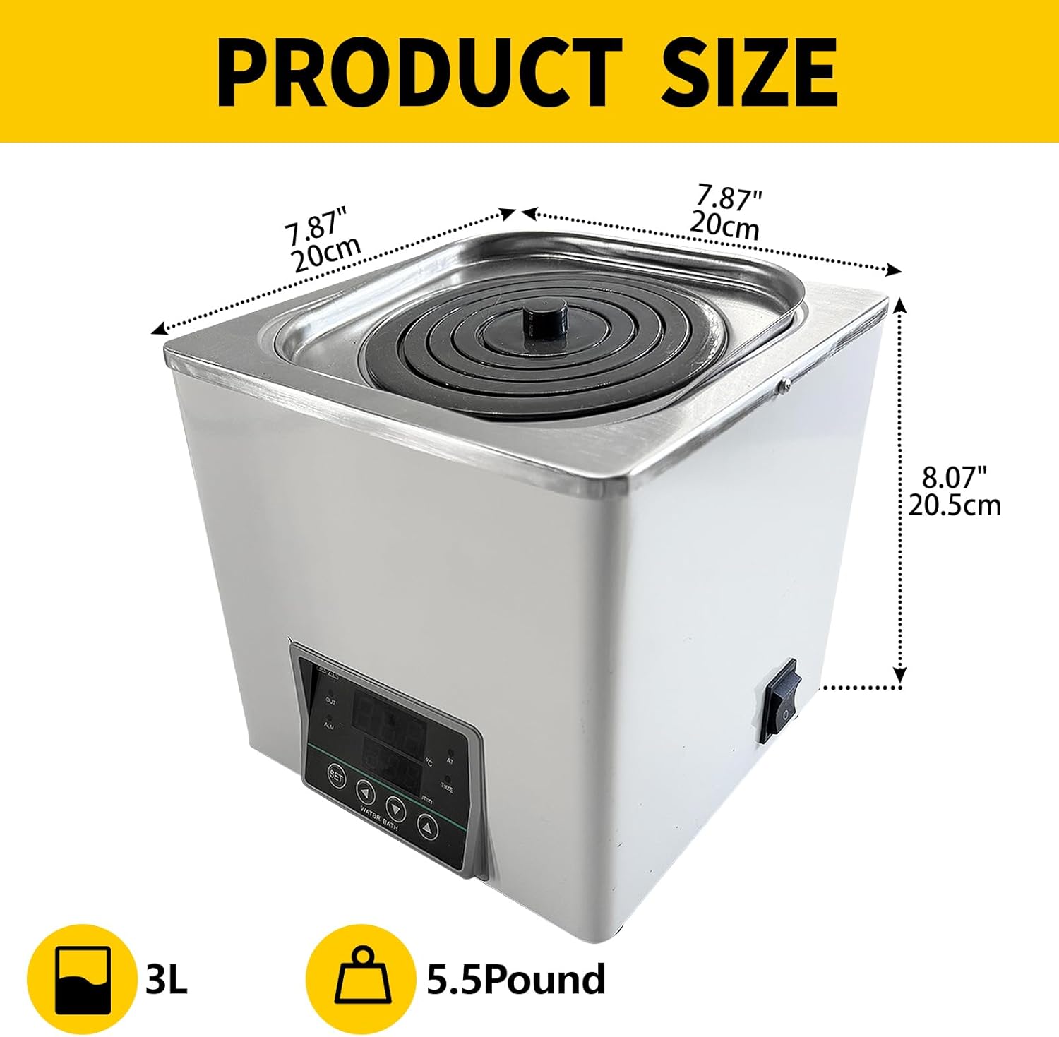 Feature:Voltage: AC110VInput power: 300WMax Volume:3LTemperature Range:Room Temperature to 100°C (210°F)Temperature control:+/- 0.1°CTemperature Setting:Increments 0.1°C incrementsDimension(WxDxH) : 6.3"×6.3"×5.1"Weight : 5.38 Pounds