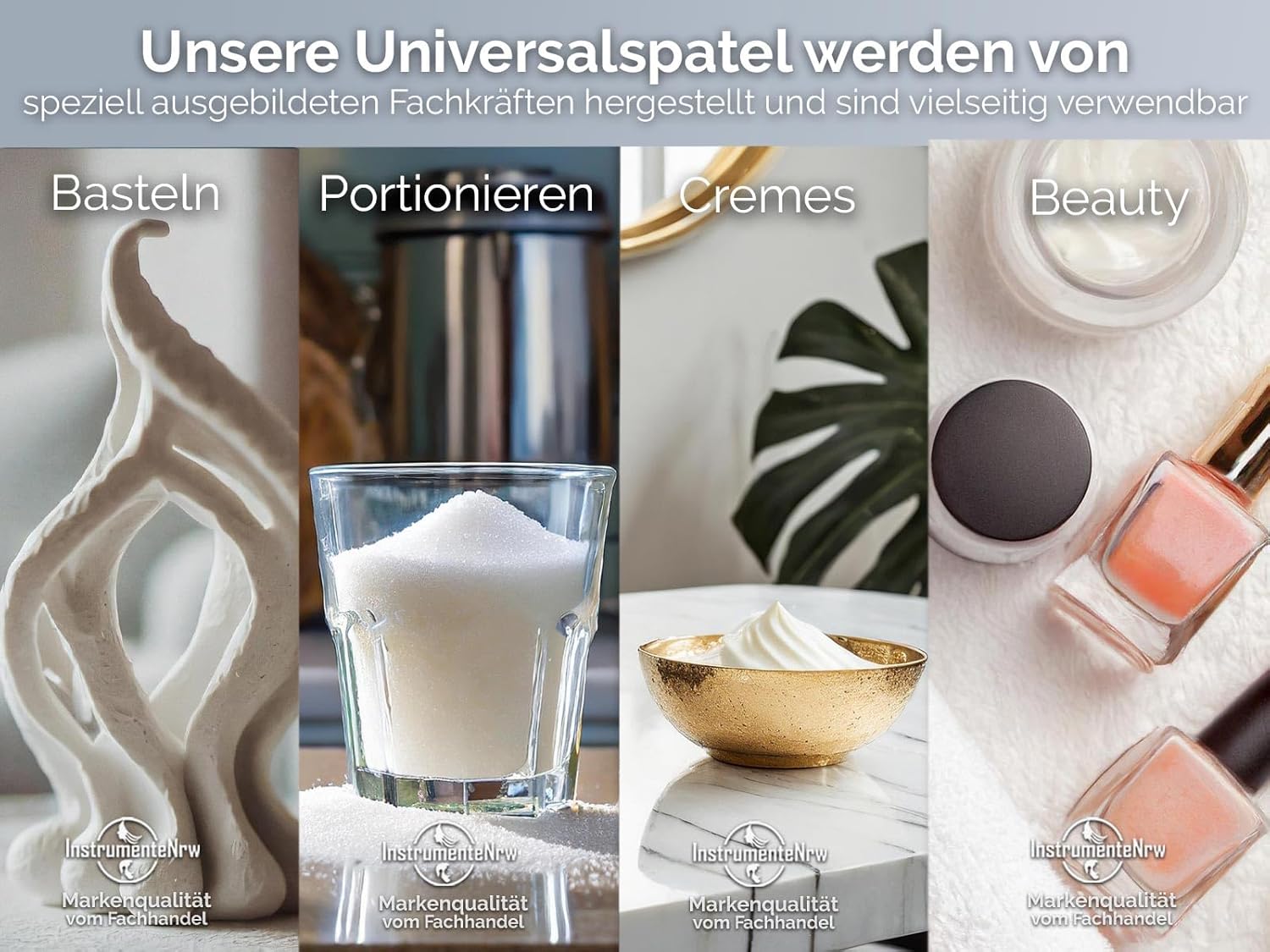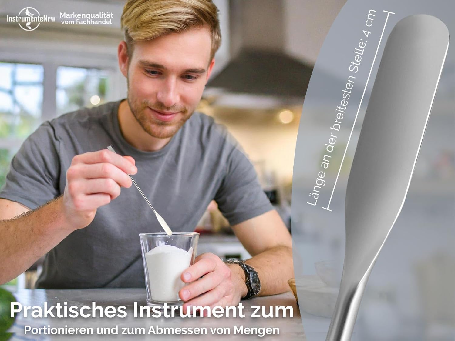 Precision spatula as a universal spatula for precise doses. Are you looking for a reusable metal ointment spatula or laboratory spatula for cosmetic making, laboratory work and crafts for the home? Then you've come to the right place. With our universal double spatula, you have the perfect tool for portioning and measuring small quantities such as creams, ointments and cement. Also very suitable in the beauty and cosmetics area for dosing or mixing. The ointment spatula is also an ideal companion as a powder spatula, cement spatula, modelling spatula, sample spatula, laboratory spatula or adhesive spatula. Whether hobby or craft area for the home. Can be used for left-handed and right-handed users. Our InstrumenteNrw universal spatula is very versatile. Product description / details: total length: 15 cm. 2 Shovel Surfaces 1 side square, approx. 4 cm long and approx. 10mm wide 2 side rounded approx. 4 cm long and approx. 10mm The handle diameter is approx. 3.5mm Balanced spatula with a rounded and a square spatula. Material: Chrome Plated Metal Easy care and easy to clean. Suitable for right and left handed users. Package Content:1 x Metal Double Spatula