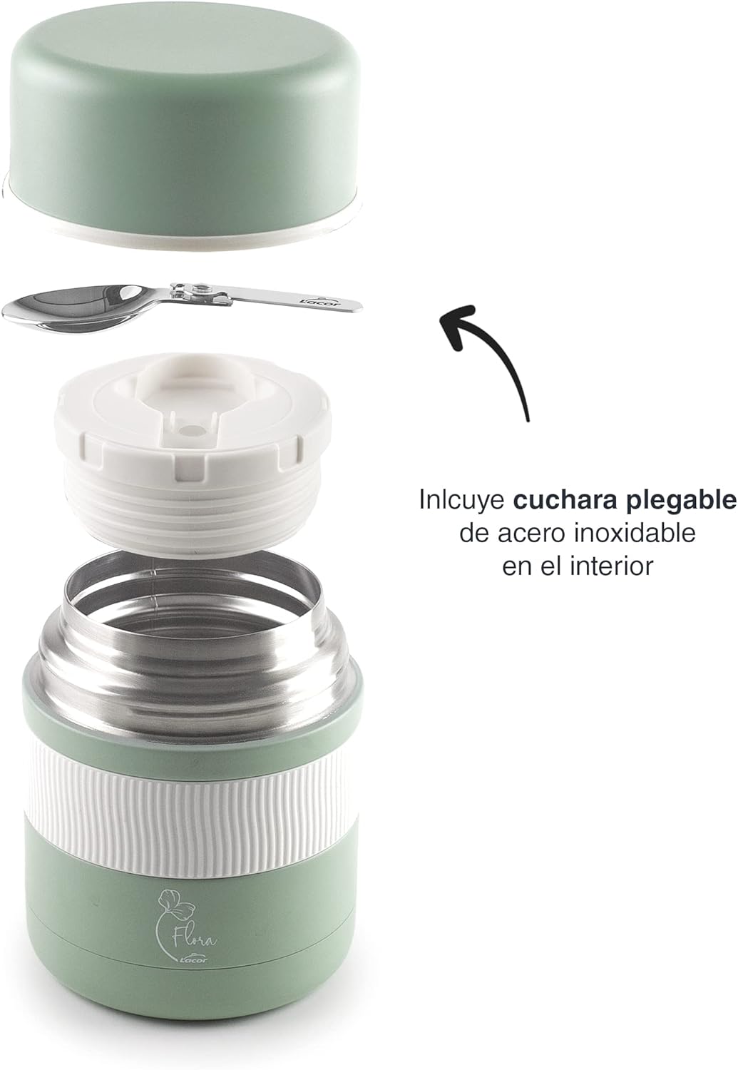 The FLORA food flask is made of top quality 18/10 stainless steel and does not contain any toxic materials; 100% BPA free. HAS A TIGHT SEAL - The screw-on lid comes with a silicone gasket to prevent spills. This item has a high thermal performance thanks to its double wall and the vacuum chamber of the container: keeps food hot up to 6 hours and cold for up to 8 hours. It also contains an extra wide mouth system, which makes it easy to fill and take food. It has a matte anti-scratch outer coating and includes a stainless steel folding spoon. It is easy to clean but not recommended for use in the dishwasher. The flask has a diameter of 10.5 cm, a height of 15 cm and a capacity of 500 ml.