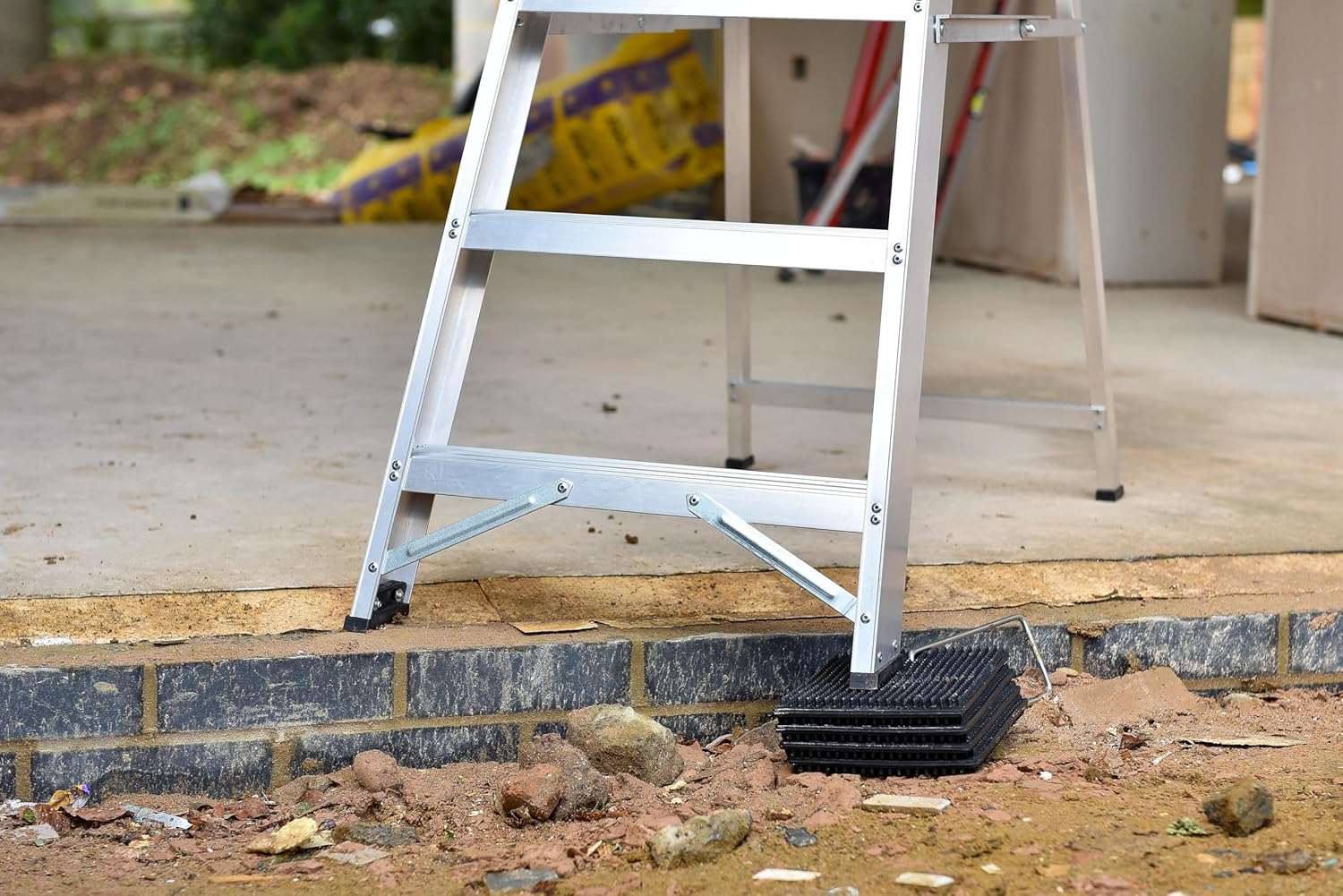 Ladders can be a problem on sloping or uneven ground. LadderMat can provide the solution to all of these. Four mats made from heavy-duty rubber matting with nodules are linked by a sturdy metal loop and offer adjustable anti-slip locking to go under the ladder foot needing extra height or it can be put under both feet to reduce the risk of slipping or of sinking into soft ground.