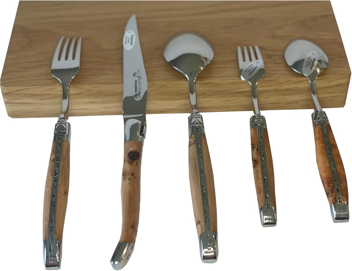 Be assured that what you are getting is an original Laguiole en Aubrac flatware set made by master craftsmen with authentic materials. Genuine Laguiole en Aubrac flatware is hand-made in France by master craftsmen with authentic French components and are guaranteed for life. These genuine Laguiole en Aubrac set a beautiful addition to any table. All pieces on this set are made of ultra strong 12C27 Sandvik Stainless Steel with a thickness of 3mm. 12C27 is a martensitic stainless chromium steel. The composition of carbon and chromium gives a unique combination of properties including: very high hardness, very high wear resistance and corrosion resistant. Packaged in a handsome two tiers French Oak gift box. Individually hardened by hand; shaping and fitting are done by hand to the craftsman’s eye. Each knife, fork and spoon are assembled from start to finish in one sequence and by a single artifice. Following Laguiole traditional style, the spring is polished on the inside and forged as one piece with its fly (forged bee). The bee is welded onto the spring stainless steel bolster. Steak Knife Blade: 4.25-in Long (11 cm), Total length: 9-in (23 cm), Fork: Handle 4.72-in (12 cm). Standard size Soup, Tea Spoons and Dessert Fork. Set Includes: 1-knife, 2 forks, 1 soup spoon, 1 tea spoon and storage box. Lifetime warranty against manufacturer defects. Laguiole en Aubrac will not repair or replace items that show obvious signs of neglect or intentional damages.