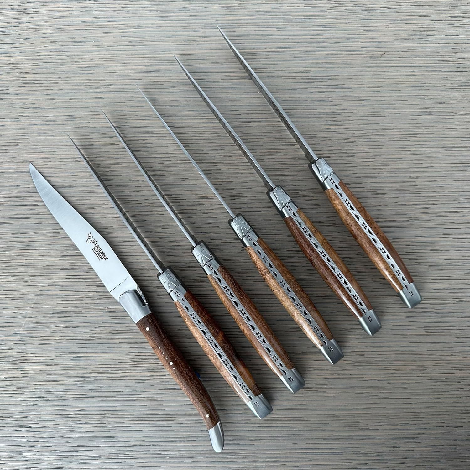 Be assured that what you are getting is an original Laguiole en Aubrac set of steak knives made by master craftsmen with authentic materials. Genuine Laguiole en Aubrac steak knives are hand-made in France by master craftsmen with authentic French components and are guaranteed for life. These genuine Laguiole steak knives are the best addition for your kitchen. The blades are made of ultra strong 12C27 Sandvik Stainless Steel with a thickness of 3mm. 12C27 is a martensitic stainless chromium steel. The composition of carbon and chromium gives a unique combination of properties including: very high hardness, very high wear resistance and corrosion resistant. Packaged in a handsome French Brown Gift Box. Individually hardened by hand; shaping and fitting are done by hand to the craftsman’s eye.