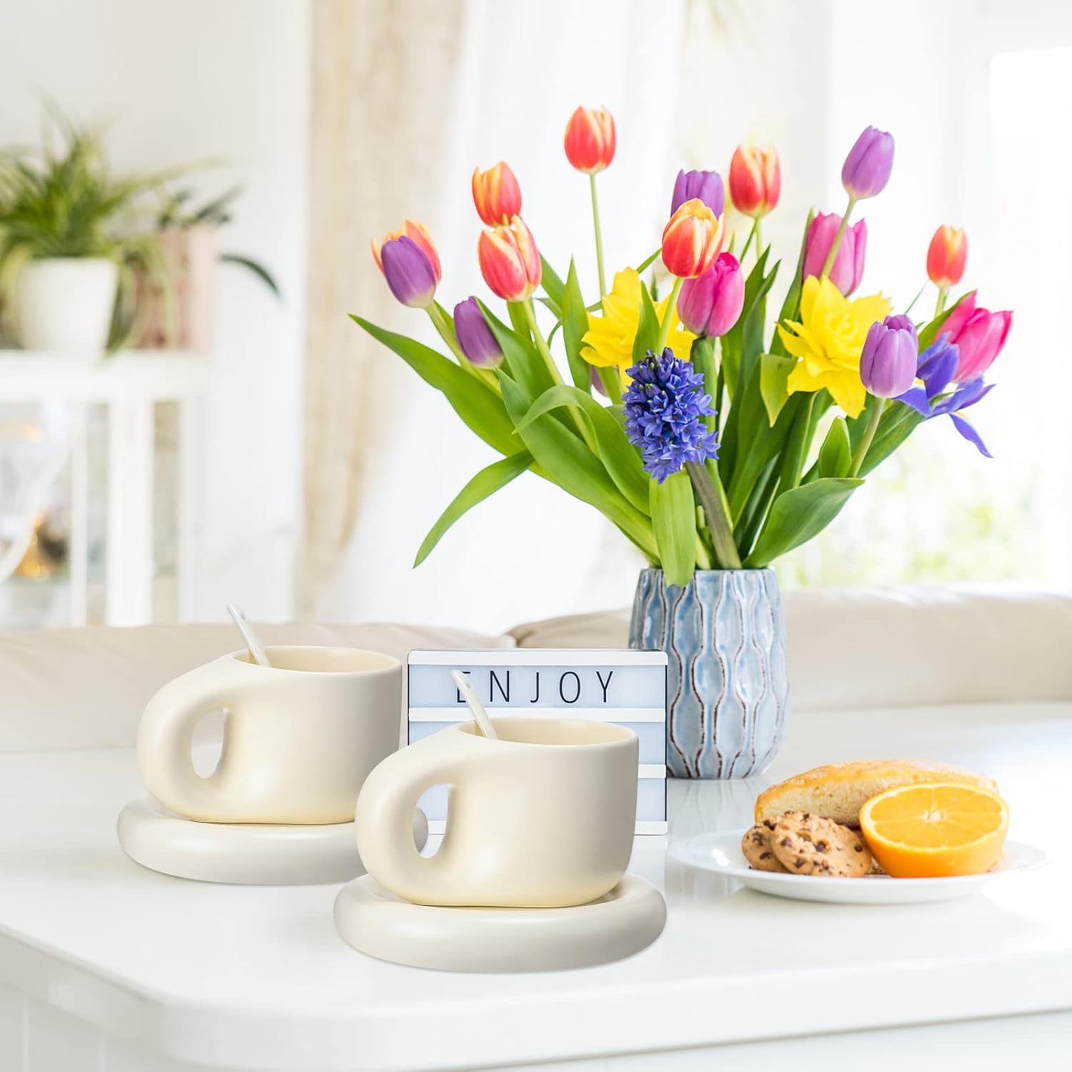 Features: Our aesthetic coffee mug is in a lovely chubby shape, suitable for gifting to children, friends, coworkers, neighbors, classmates, or other family members. This coffee cup is practical and applicable in school, office and home, available for birthday, Mother's Day, wedding, family gathering and more. Our ceramic cups are designed with smooth brims, which will not hurt your hands or lips when drinking, and you can easily clean the inner cup wall with brushes (not included), just enjoy your coffee time. Specifications: Material: ceramic Color: beige Size: as the picture shown Package includes: 2 x Chubby mugs 2 x Saucers 2 x Spoons Notes: Manual measurement, please allow slight errors on size. The color may exist a slight difference due to different screen displays.