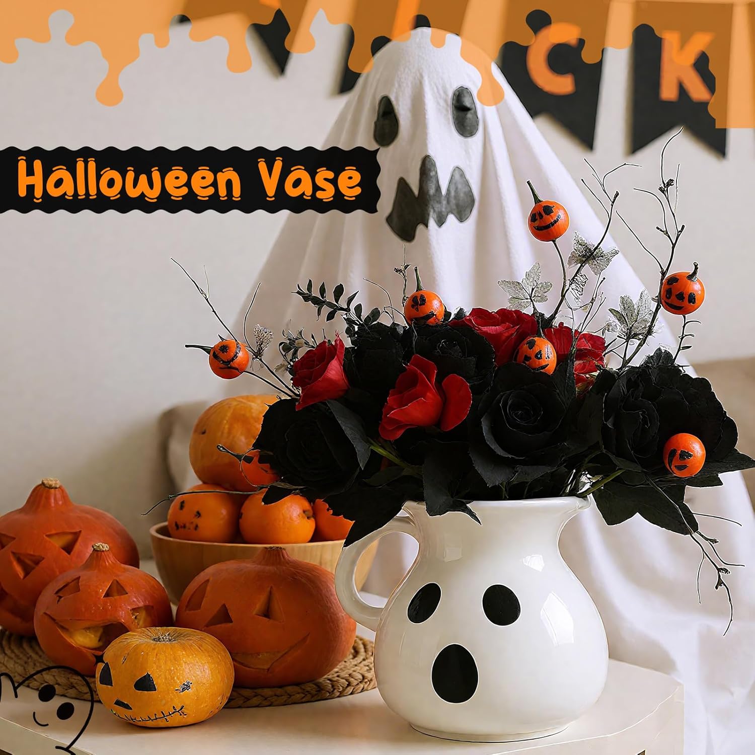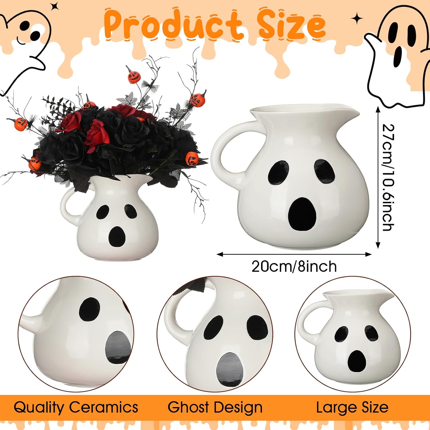 Features: A single surprise: Each package includes a ceramic vase set of this whimsical decor, ensuring a unique ghostly presence in your holiday celebrations. Its singularity adds a touch of exclusivity, making it a standout piece that draws the attention of all who enter your haunted haven. Two tone terrific in black and white: The striking black and white color palette enhances the ghostly charm, creating a captivating visual contrast. Whether applied as a decor piece or treat holder, it seamlessly fits into various interior styles, adding a hint of monochrome magic to your Halloween setup. Specifications: Material: ceramic Main color: white, black Size: about 11 inch high Package includes: 1 x Halloween table decor Notes: Manual measurement, please allow slight errors on size. The color may exist a slight difference due to different screen displays.