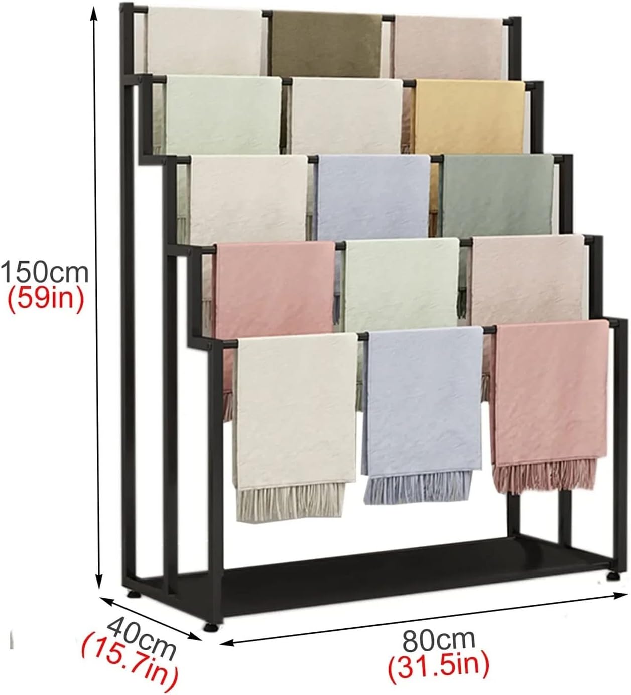 Product Description: Our scarf hangers are not only for giving a unique present to anyone but only for decoration in the house, living room. You will love being able to hang more items ever. Specification: Material: Iron Size: 60x40x150cm/23.6x15.7x59in, 80x40x150cm/31.5x15.7x59in, 100x40x150cm/39.4x15.7x59in, 120x40x150cm/47.2x15.7x59in, Size: Tall: 150cm/59in Width: 40cm/15.7in, Length: 60cm/23.6in, 80cm/31.5in, 100cm/39.4in, 120cm/47.2in, Weight: 5kg/11lbs, 6kg/13.2lbs, 7kg/15.4lbs, Weight Capacity: 50kg/110lbs Requires Assembly: Yes Application: Perfect For Hallway, Entryway, Bedroom, Bathroom, Closet, Laundry Room, Balcony, Garage, Laundry Room, Boutique. Features: Heavy weighted base for stability. The scarf rack organizer is made of the strong steel with a durable rust-resistant finish. Can hold scarfs, chains, sashes belts, towel, shawls, jeans hijab and more. Packaging: Scarf Stand x 1 Notice: 1. The product size is purely manual measurement and there is an error of 1-2cm.It is a normal phenomenon. 2. Decorative items shown in product photos are not included. 3. Please be reminded that due to the light and screen difference, the item's color may be slightly different from the pictures.