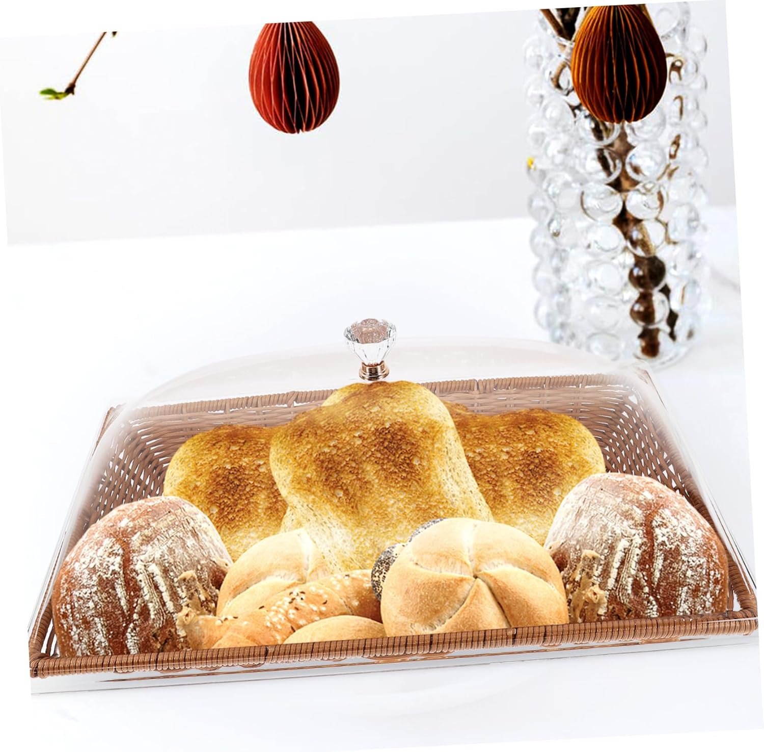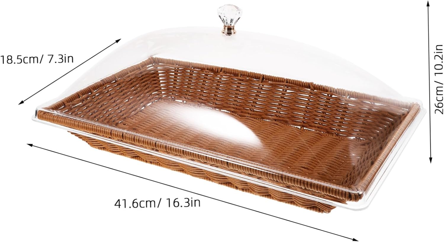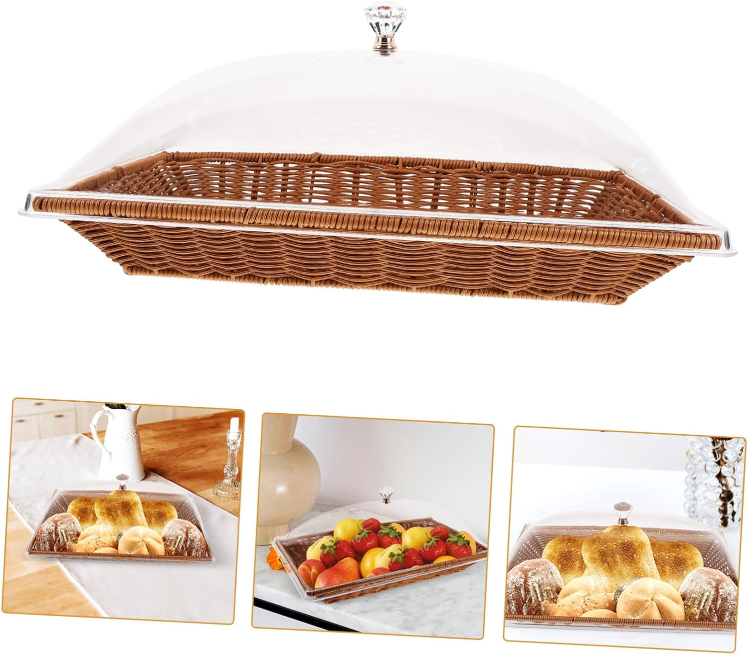 Package List 1 x basket 1 x lid Features -Product Info:Food fresh-keeping basket - Size: 41.60X26.00X18.50cm/16.35X10.22X7.27in picnic basket food storage -Material:PP, acrylic imitation rattan basket - This multi-functional basket is practical and can be used as a food serving tray or organizer, very useful in daily Food Serving Basket. - The transparent cover of the basket not only protects the contents from stains but also allows for easy visibility Bread Baskets With Lid. - basket for food - Made from food-grade and materials, this basket a healthy and safe storage solution for food bread bowls for serving. - With its lightweight and smooth design, this basket is easy to carry, handle, rounded edges provide protection covered snack basket. - The multifunctional basket is designed with transparent handle lid, making it perfect for storing or displaying basket for bread.Goods InformationFood Basket Its sleek color and minimalist design make it a stylish addition to any home.fruit picking basket With its large size, it offers ample space to hold a large portion of food.table basket The food basket is a versatile storage holder that can be used as a fruit basket, bread basket, or general storage basket.bread baskets for table This basket is and resistant to deformation