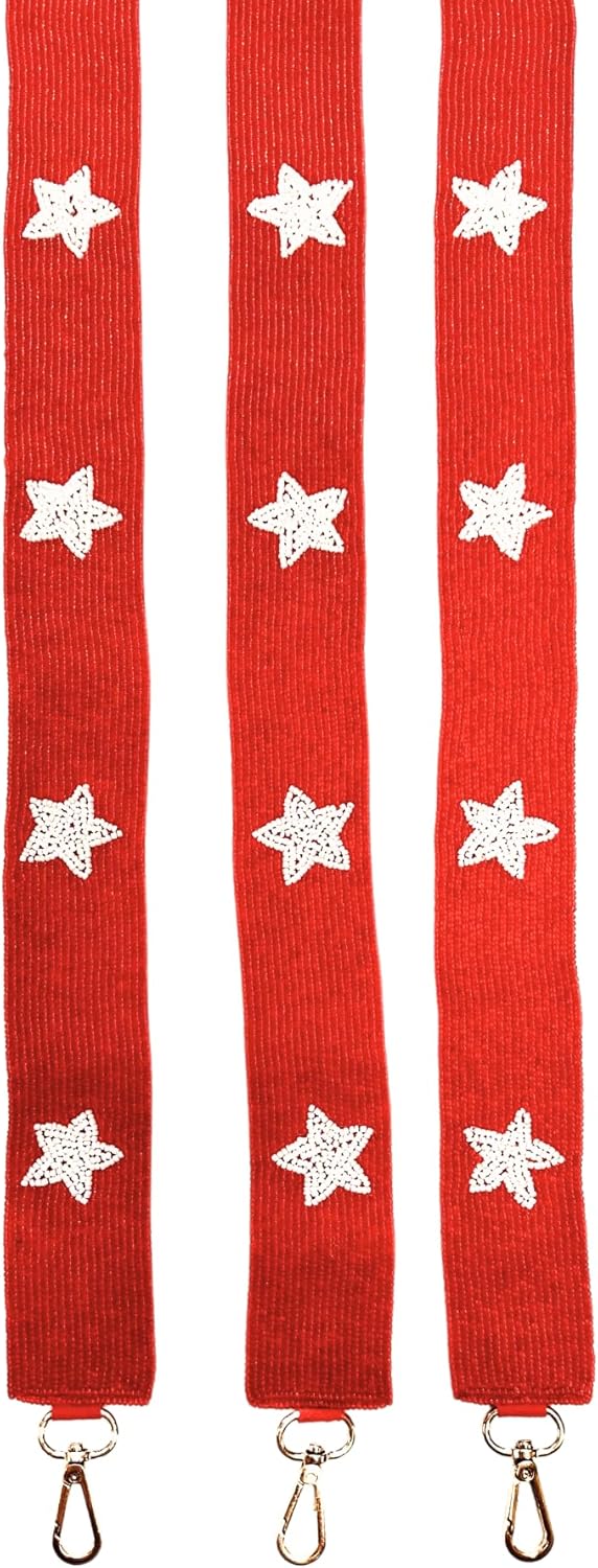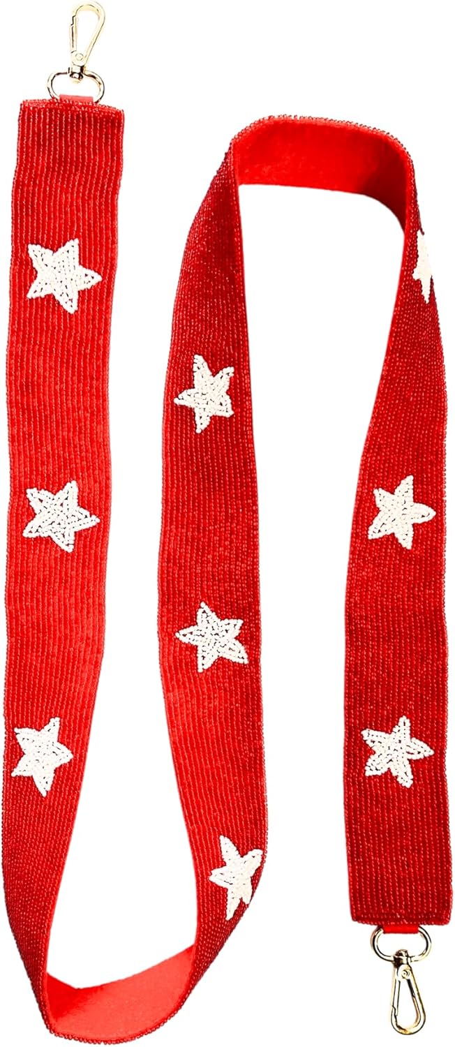 Elevate your game day style with our stunning Beaded Purse Strap in vibrant red adorned with enchanting white stars. This 49" long and 1.75" wide strap is a versatile accessory designed to showcase your team spirit. Our White Stars Beaded Purse Strap adds a touch of elegance and personality to your game day attire. Crafted with meticulous attention to detail, the strap features dazzling white stars that shimmer and shine with every step you take. It's the perfect complement to your game day outfit, turning heads and making a statement of team pride. Designed for both fashion and function, this Beaded Purse Strap is not only stylish but also sturdy. It easily attaches to your favorite purse, handbag, or crossbody, transforming it into a game day-ready accessory. The adjustable design ensures a comfortable fit, allowing you to wear it your way. This unique beaded purse strap is a fantastic gift for her, adding a touch of sports-inspired charm to her game day ensemble. With its versatile design, it's suitable for clear stadium bags, coin purses, and a wide range of handbags. Don't miss the opportunity to stand out in the crowd and support your favorite team in style. Elevate your game day look with our Beaded Purse Strap, and make every game day a fashionable celebration of team spirit. Add it to your cart today and be the envy of fellow fans!