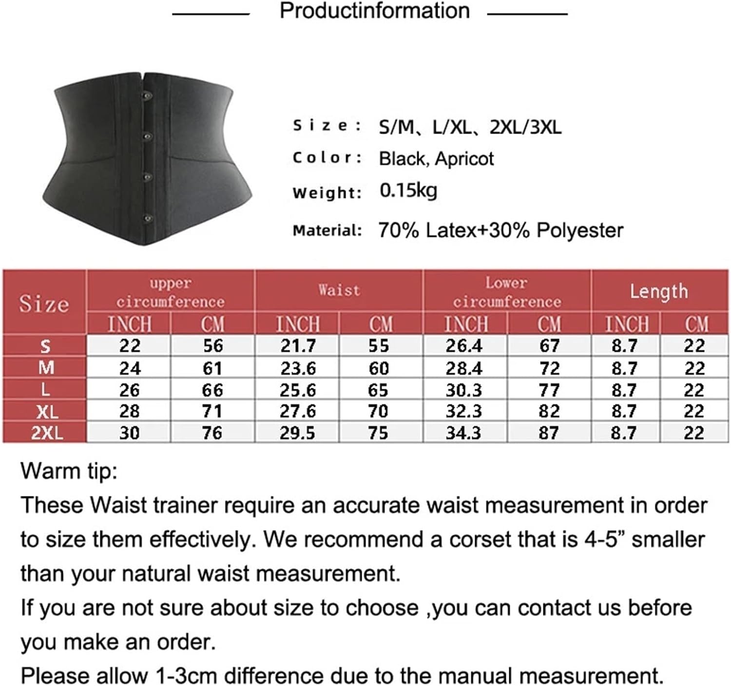 Alias: Waist Trainer Corset & Waist Corset Material 70 Latex30% Polyester Color: Black, Apricot Size: S, M, L, XL, 2XL Featuer: 6 Steel Boned, Elasticity, Delicate workmanship Weight 0.2KG/piece Package Include: 1pc Waist Trainer/bag Function : Waist shaper, Bust up Function: Body Building, Waist Protecting, Bust Push Up, Flat Stomach, Improved Posture, Postpartum Recovery, Instantly Smaller Waist Occassion: Outdoor & Indoors Activities Fitness Shopping Home Staying etc