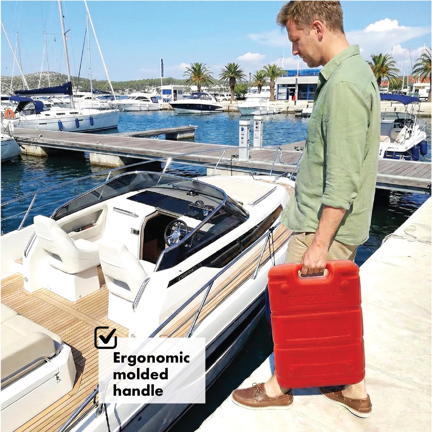 • Easy Transport and Storage: Our portable outboard transfer tank, complete with the molded top handle, is your ticket to hassle-free transportation. From the dock to your fishing vessel or small boat, it's a breeze. Plus, its compact design fits snugly under boat seats, saving you precious space.