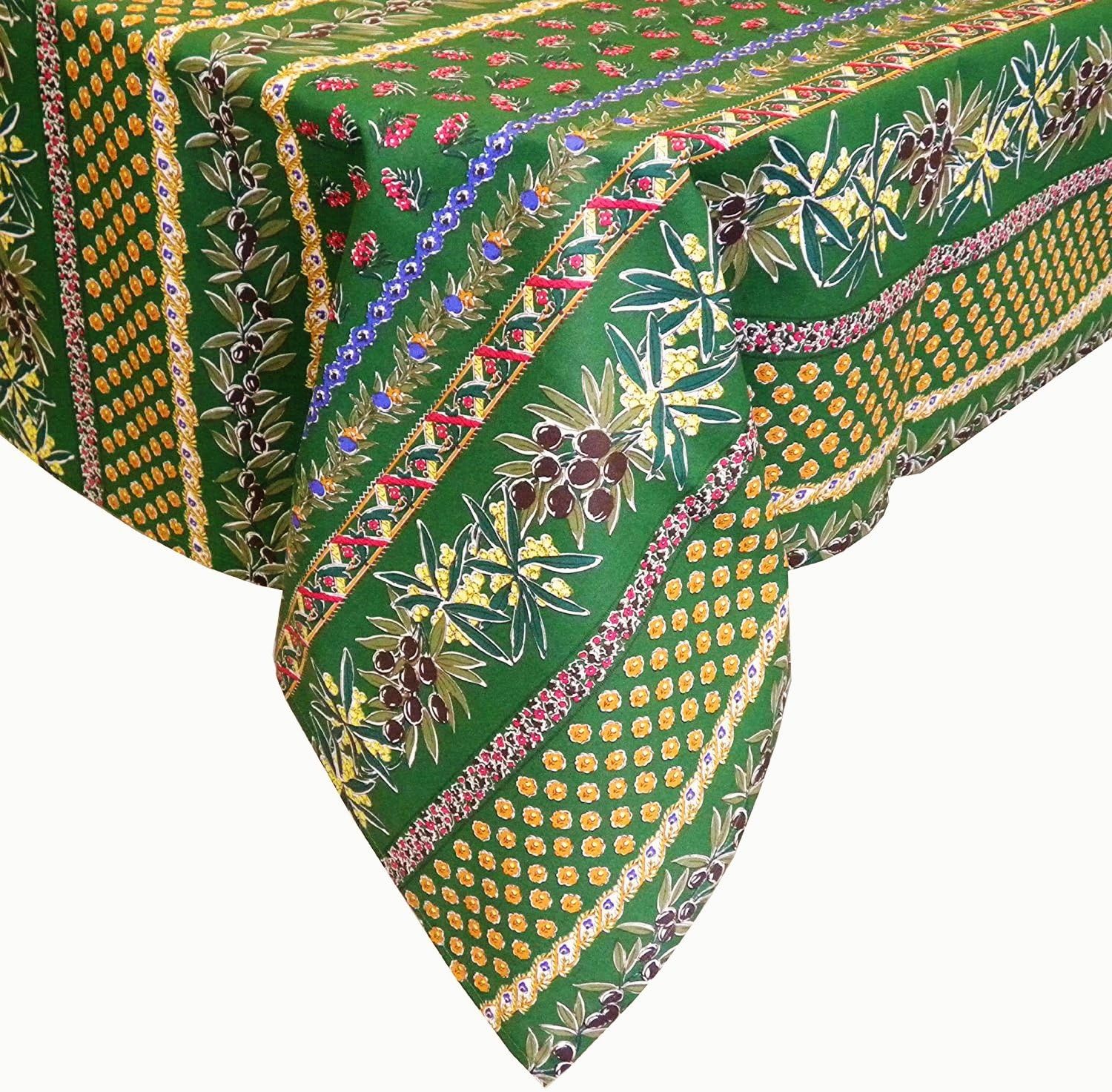 Le Cluny, Olives and Mimosas, Green, French Provence 100 Percent Coated Cotton Tablecloth, 60 Inch x 60 Inch Square.
