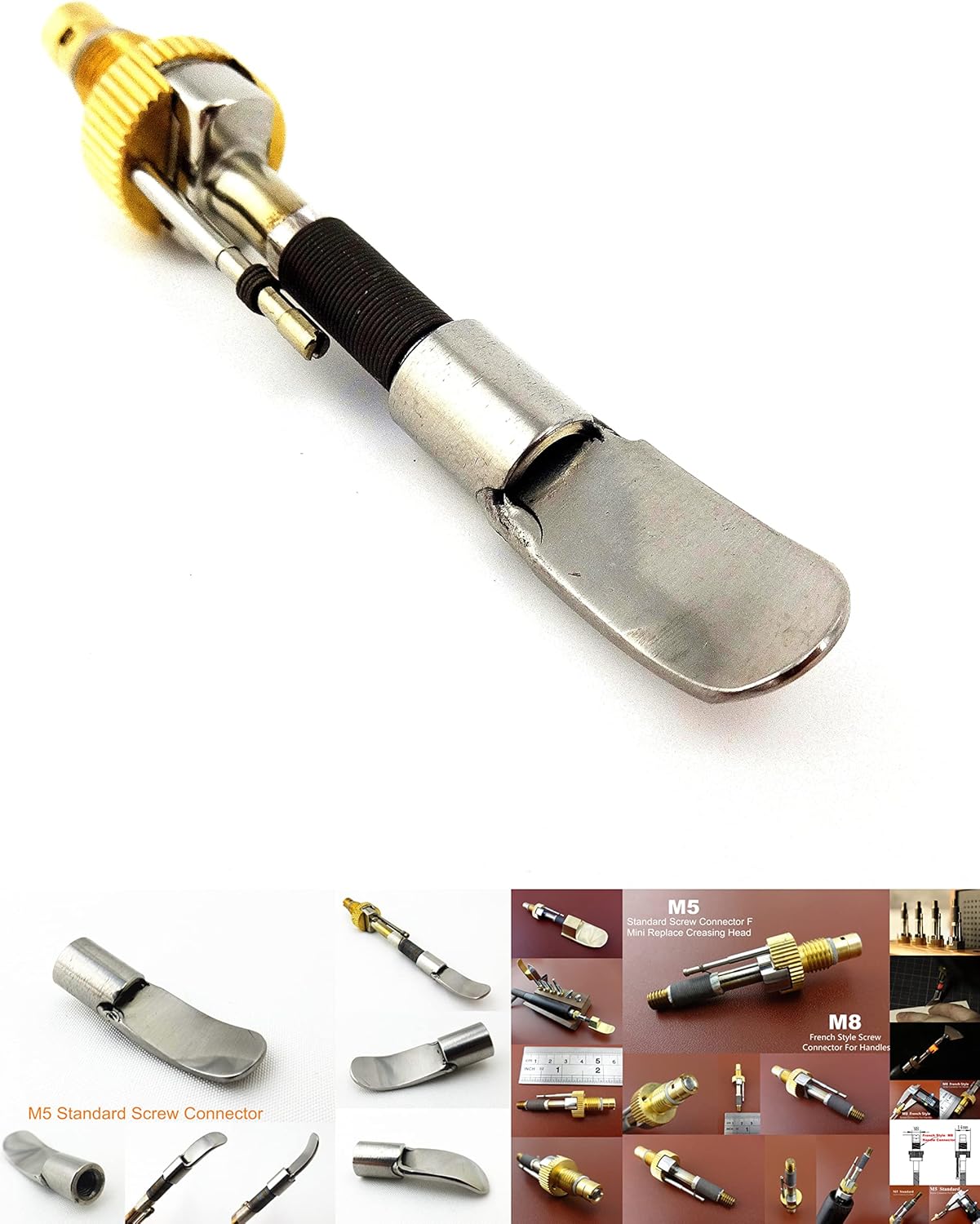 • Heater Bar Heating Element Body Head Tip Tool Please Note, These Iron Tip Fully Compatible With All French Style M8 Thread Screw Connector Handles & Electric Edging Creasing Machine, Such As Regad, Adece, Hermes etc. Machines & Handles. These Accessories Are Screwed Directly Into The Handles. Material: Stainless Steel & Brass Total Length of Tool: 60 mm (2.4”) M8 Thread French Style Screw Connector For Handles. M5 Thread Standard Screw Connector For Mini Replaceable Creasing Head.
