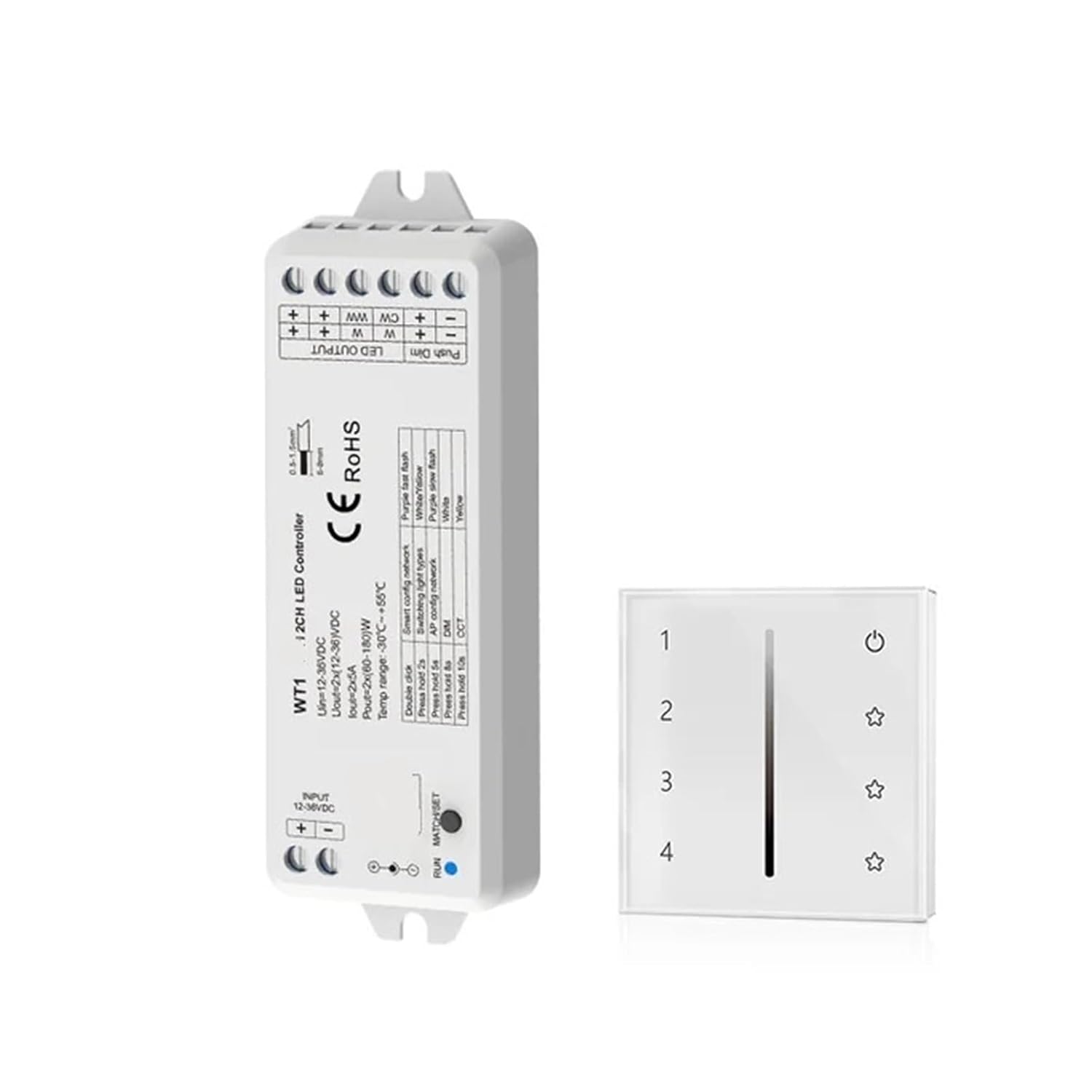 Outlet & Switch CombosConnect an external push button switch to achieve on/off and 0-100% dimming functions.The light on/off fade time is optional for 3 seconds.Model: WT1, T21, T22Material: ABSOrigin: Mainland ChinaProduct Type: DimmerInput voltage: 12-36VDCInput current: 10.5AOutput voltage: 2×(12-36)VDCOutput current: 2CH, 5A/CHOutput power: 2×(60-180)WControl distance: 30m (barrier-free space)Working temperature: Ta: -30℃~+55℃Case temperature (maximum): T c: +85Protection level: IP20