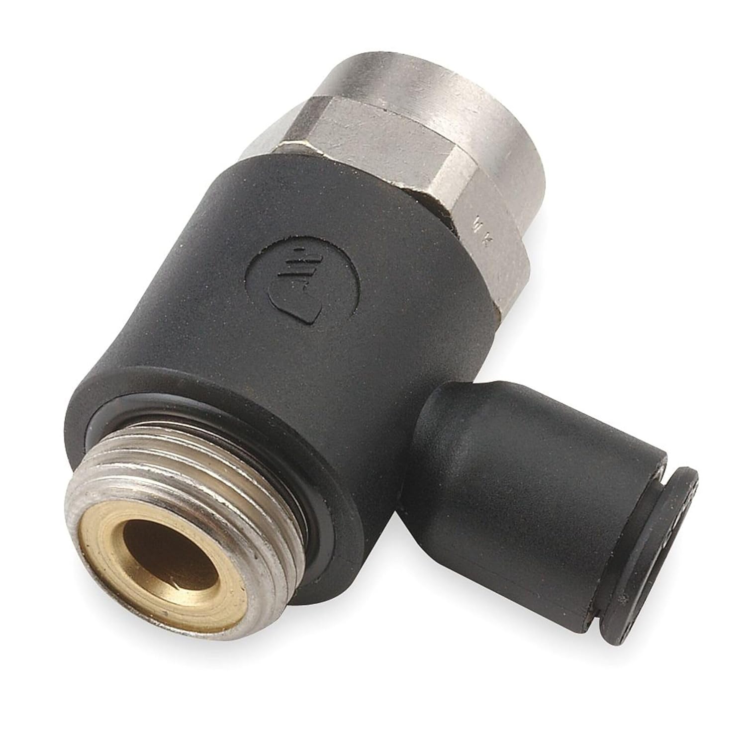 This Parker Legris 7010 series flow control valve is housed in a banjo-style body with a 90-degree angle and is suitable for use in metering outlet air flow in pneumatic applications. A recessed slotted screw is used to adjust air flow on the outlet side. The nylon banjo body is impact-resistant, the nickel-plated brass threaded fitting is corrosion-resistant, and the nitrile butadiene rubber (NBR) O-ring is resistant to oil and chemicals. The banjo body has a female push-to-connect tubing end and the housed nickel-plated fitting has a male Unified National Fine (UNF) threaded end with a sealing O-ring. It has a maximum operating pressure of 145 pounds per square inch (psi) and a working temperature range of 32 to 158 degrees F. The valve complies with the Council of the European Union 2006/42/EC directive and the Pressure Equipment Directive (PED) 97/23/EC standards for safety and complies with Reduction of Hazardous Substances (RoHS) regulations. This air flow control valve is suitable for use in pneumatic applications such as in laboratories, food and beverage processing, and paint and printing industries.Flow control valves manage the flow of air, water, or other fluids between pipes, tubes, or hoses. They have two ports and adjustment screws to restrict or direct flow through the valves. The adjustment moves a disc toward or away from the center of the valve to act as a plug to restrict or open the flow path, depending on screw adjustments. Control valves sometimes include either a ball cone (which utilizes a spring-loaded ball seated against a cone-shaped interior surface to block the flow) or a swing check valve (which has a movable disc on a hinge to block reverse flow). Flow control valves are used in various applications, including machine tools, airplane and truck controls, and automated production lines.Parker Hannifin manufactures electromechanical, hydraulic, and pneumatic motion technologies and systems for liquid handling, filtration, sealing and shielding, climate control, process control, and aerospace applications. The company, founded in 1918, is headquartered in Cleveland, OH.