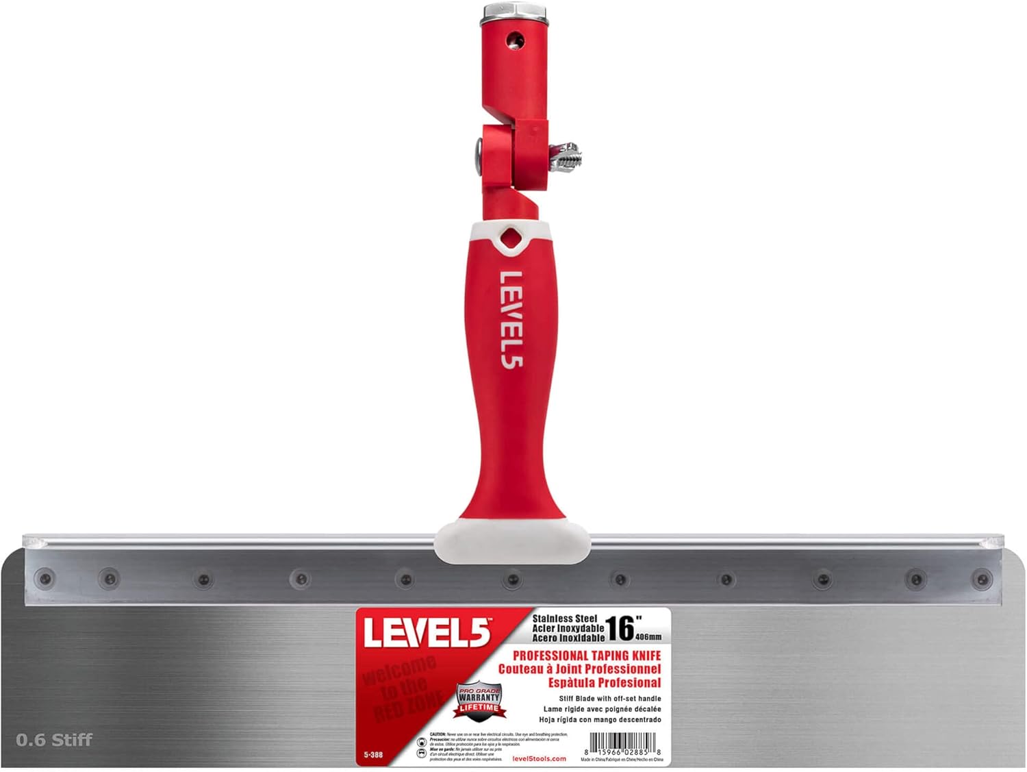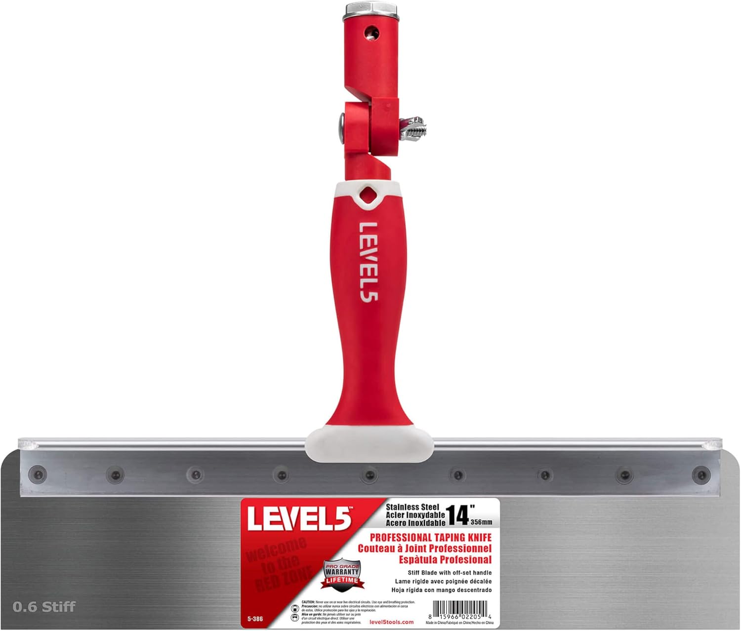 LEVEL5 Offset Finishing Knives feature a handle that is offset slightly from the blade edge. This design enables you to lay the blade flatter against the wall for a smoother, tighter finish without coming into contact with your hand. The end result? You'll be able to produce a top notch finish easier and more efficiently, while simultaneously reducing wrist and hand fatigue.LEVEL5 Offset Finishing Knives also feature a unique, ergonomic handle design that enables you to remove the hammer end and so you can mount the knife to a standard painter's pole or a LEVEL5 extendable skimming blade handle (using an optional adapter). You can then adjust the knife to any angle for any job.- Premium Quality Blades | LEVEL5 Offset Finishing Knives are manufactured using premium, precision cut stainless steel.- Ergonomic Handle | Comprising a strong, glass-filled polypropylene core overmolded with soft grip TPR for all-day comfort. - Heavy Duty Construction | The handle is permanently affixed to the 5mm thick aluminum blade mount using multiple heavy duty stainless steel rivets. Unlike other designs, this handle will not spin or loosen over time with heavy commercial use.- Removable Hammer End | On top the handle is a die-cast zinc hammer end that can be used to reset drywall screws. It also serves as a cap to ensure joint compound can't fill the handle when in use without the provided angle adaptor.Available with stiff or flexible blades.Lifetime GuaranteeLEVEL5 Offset Finishing Knives come with the company's legendary Lifetime Guarantee against defects in materials and workmanship. See the LEVEL5 Warranty documentation for full details.