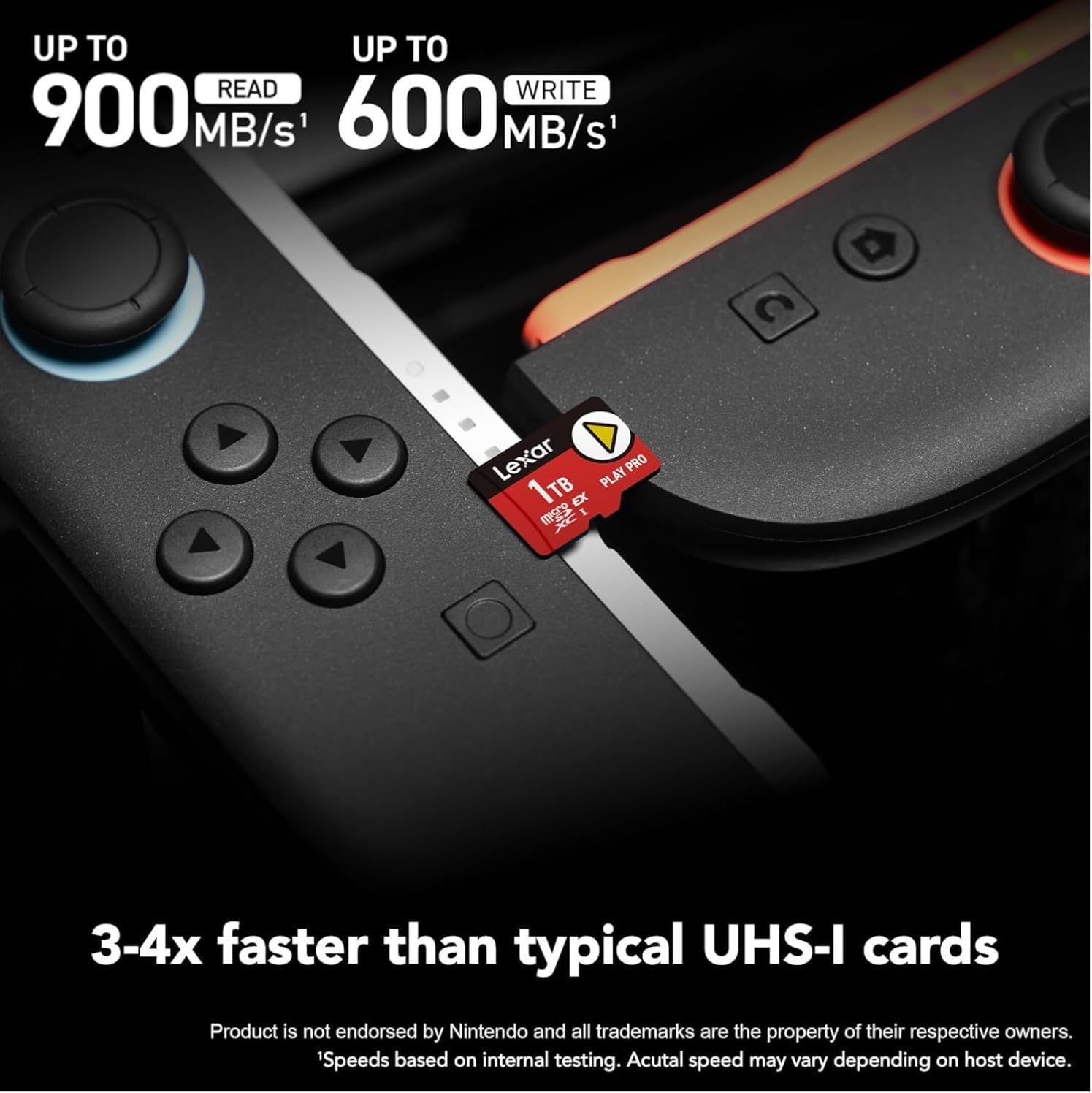 Lexar 1TB PLAY PRO microSDXC Express Memory CardThe Lexar PLAY PRO microSDXC Express Card gives gamers an epic performance power-up with up to 900MB/s read and 600MB/s write, and a capacity of up to 1TB, offering space for many AAA games.Revolutionary PerformanceThanks to its next-gen tech of PCIe and NVMe interface technologies that deliver up to 900MB/s read speed, the PLAY PRO microSDXC Express Card is a stunning 4x faster than typical UHS-I microSD cards – meaning that games load faster and also ensure a smooth, lag-free experience for your Nintendo Switch 2 and other next-gen handheld gaming devices.Cut Your Download TimesThe PLAY PRO microSDXC Express Card also delivers 600MB/s write speeds when paired with the Lexar microSD Express card reader, so you can download a AAA game in less time than it’ll take you to order a pizza.Massive Capacity of 1TBSome of your favorite games are probably pretty big in file size. Well, with up to 1TB capacity, juggling games just got easier. You can fit many games on a 1TB card.Good for Today, Great for TomorrowThe PLAY PRO microSDXC Express Card is backwards-compatible with UHS-I and UHS-II host devices (at UHS-I speeds), so you can use it with your current handheld gaming consoles – and it’s ideal for the Nintendo Switch 2.Protection Built inThe PLAY PRO microSD Express card is IPX7 waterproof, wear-proof, temperature-proof, x-ray-proof, vibration-resistant, magnetic-proof, shockproof, and drop-proof.Bundle Includes:Lexar 1TB PLAY PRO microSDXC Express Memory Card2-in-1 USB 3.0 Memory Card Reader for SDXC, SDHC, SD, Micro SDXC, Micro SD, Micro SDHC Card