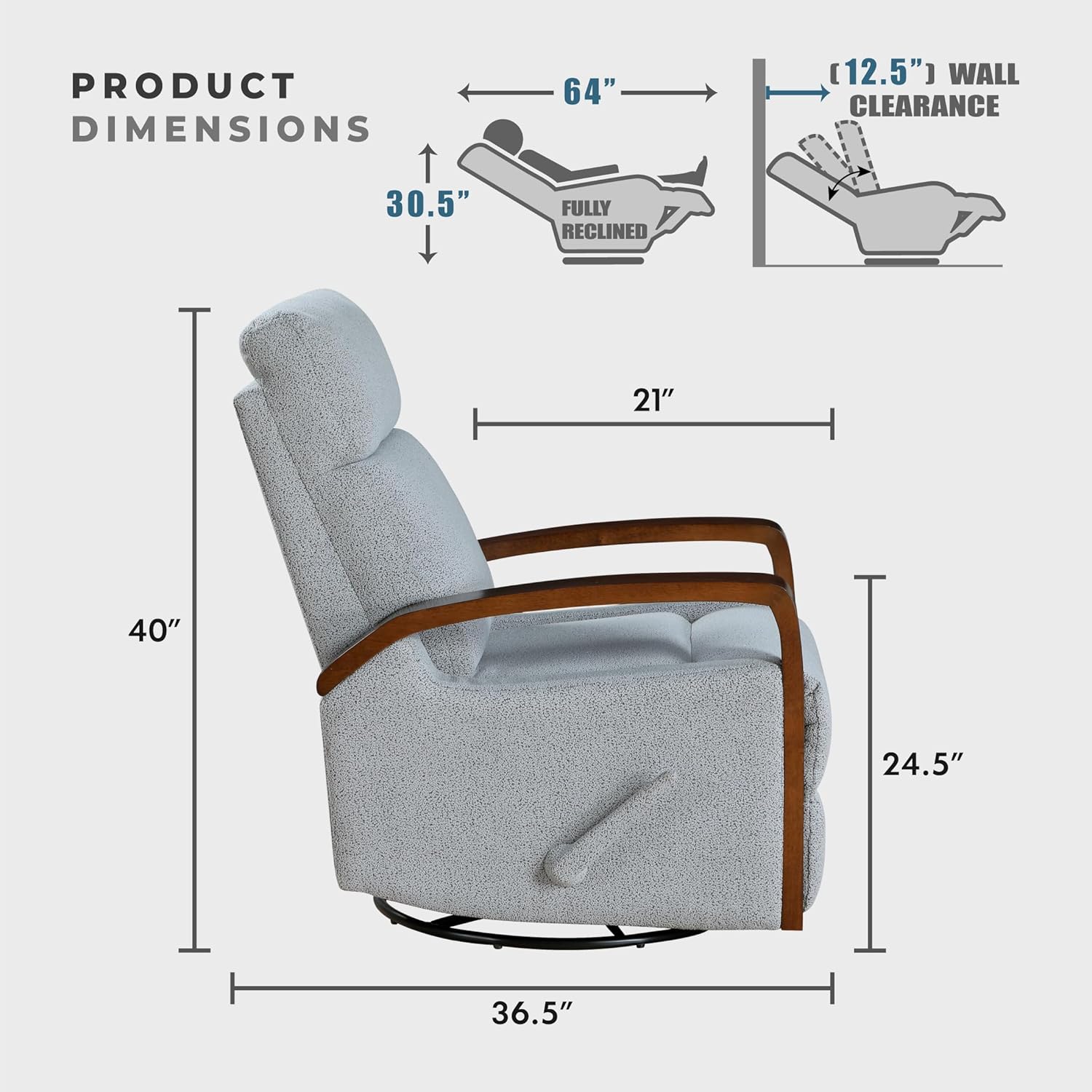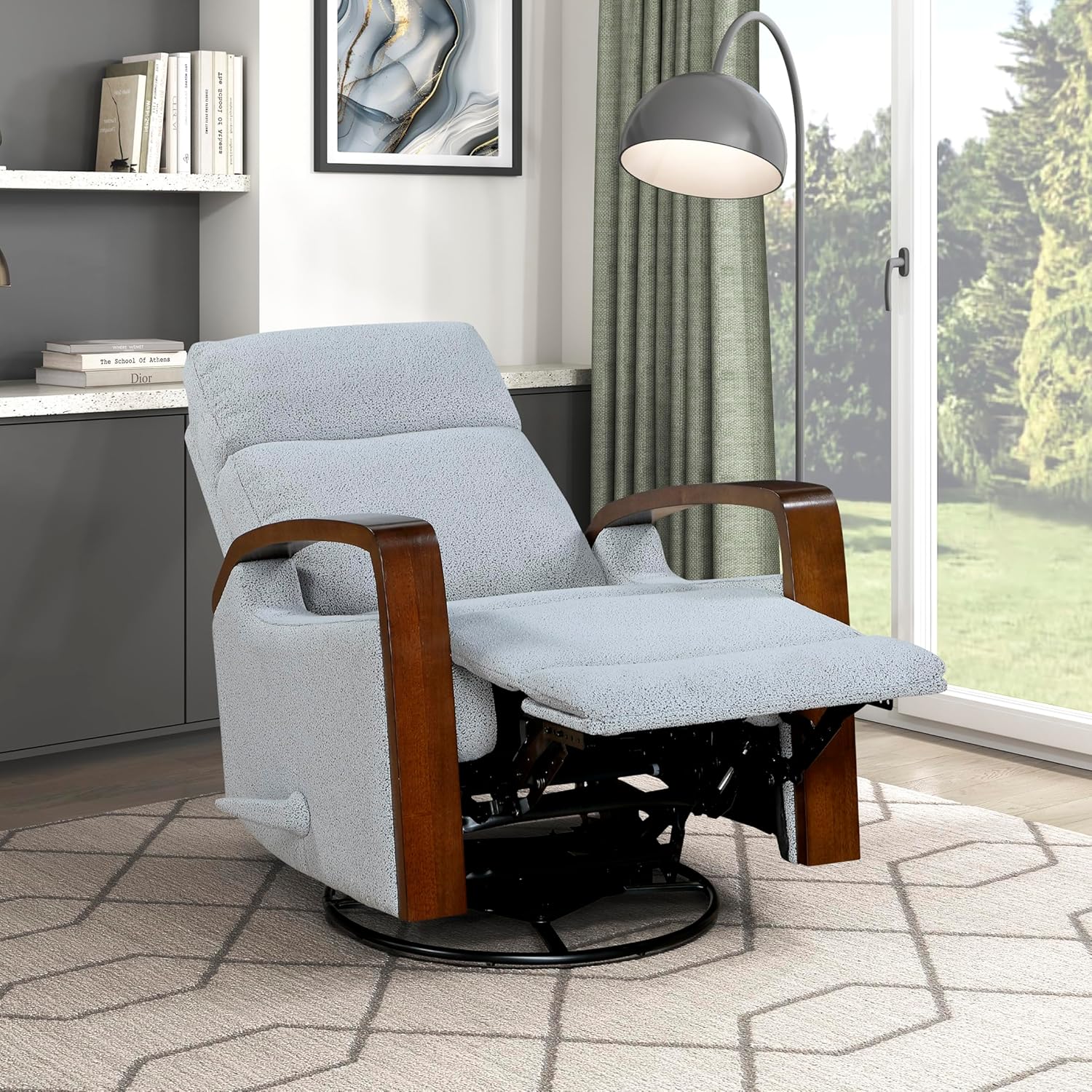 Relax in tailored comfort and timeless style with this 360 degree swivel glider recliner. Built with a wood frame and reinforced metal seat, it offers long-lasting support and luxurious ease. Foam padding over resilient pocket coils ensures lasting comfort, while boucle fabric keeps the experience cool and stylish. With a gentle gliding motion and smooth swivel base, this recliner adapts to your every move. Wooden arms in a warm brown finish lend an elegant, furniture-like feel. Whether you're winding down after a long day or soothing a newborn to sleep, this chair brings refined comfort to your home.