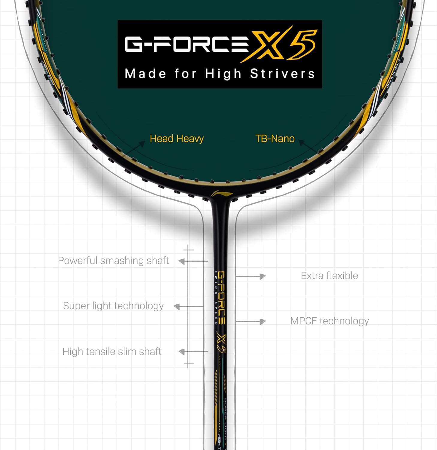 Built with a powerful smashing shaft that delivers your offence attacks with mighty force. G-force X5 racket is made with a reinforcing technology that uses multi-layered carbon fibre to boost frame strength and enhance the intensity of your shots. The racket head has a dynamic optimum frame shape with an enlarged sweet spot without sacrificing durability.