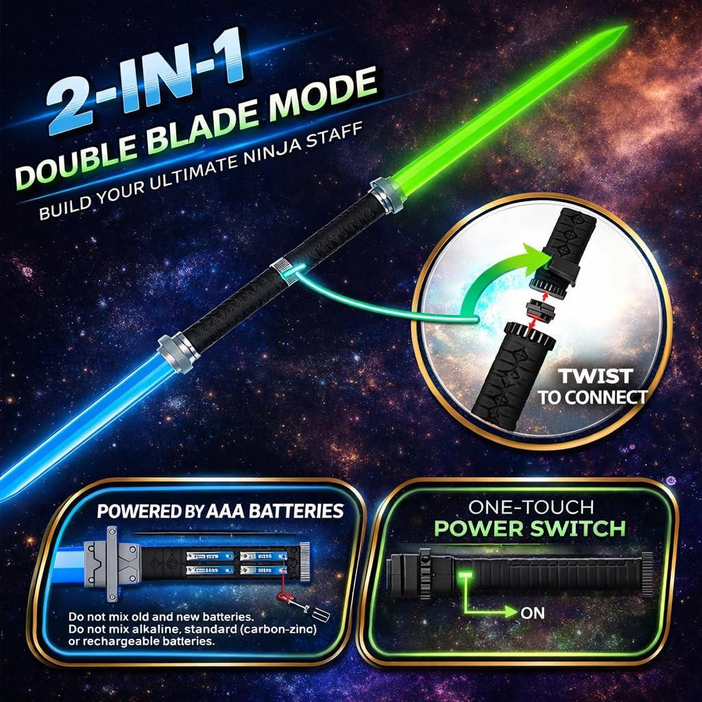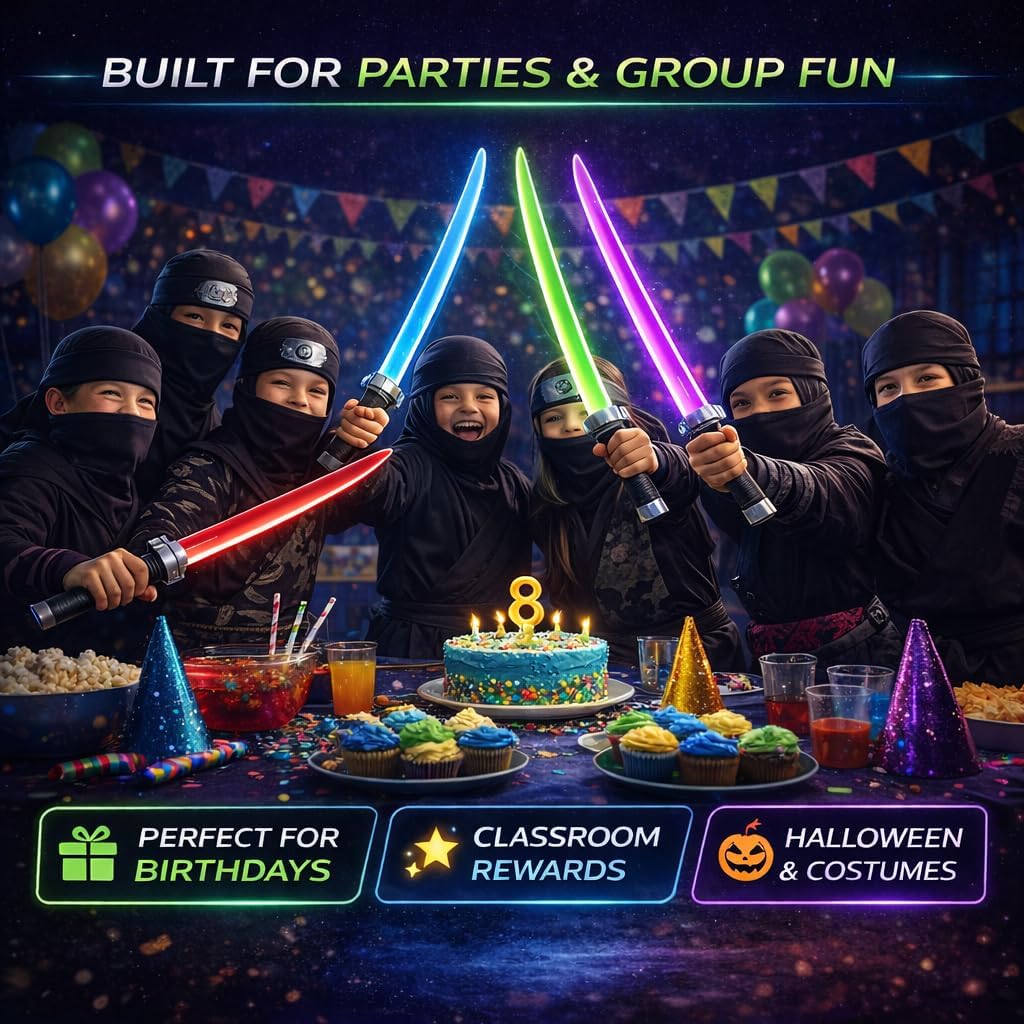 Light up every party, playdate, and backyard adventure with this premium 12 Pack of Light Up Ninja Swords for Kids - motion-activated LED katanas that glow bright, clash loud, and instantly turn pretend play into epic ninja action. Each 24.5 inch sword features bold LED lights, realistic battle sound effects, and a high-quality katana-style handle designed for comfortable, all-day play. Kids love the motion-activated technology that lights up with every swing, creating an exciting glow that makes nighttime battles, ninja birthdays, Halloween costumes, and indoor pretend play feel even more immersive. With the easy 2-in-1 connect mode, any two swords twist together to form a double-ended battle staff, giving kids multiple ways to play and doubling the fun for groups. This bulk 12-pack is perfect for ninja party favors, classroom rewards, cosplay accessories, carnival prizes, or stocking up for playtime with siblings and friends. Built with durable, kid-safe plastic, rounded edges, and replaceable batteries, these LED ninja swords are made to last far longer than cheap toy swords that snap or dim after one use. Whether your child is gearing up for a ninja birthday party, a Halloween costume, a glow-in-the-dark backyard battle, or simply loves light up swords, LED katanas, and active pretend play, this set delivers unbeatable excitement and value. Give kids the ultimate glowing weapon pack and watch their imaginations come alive with every swing.