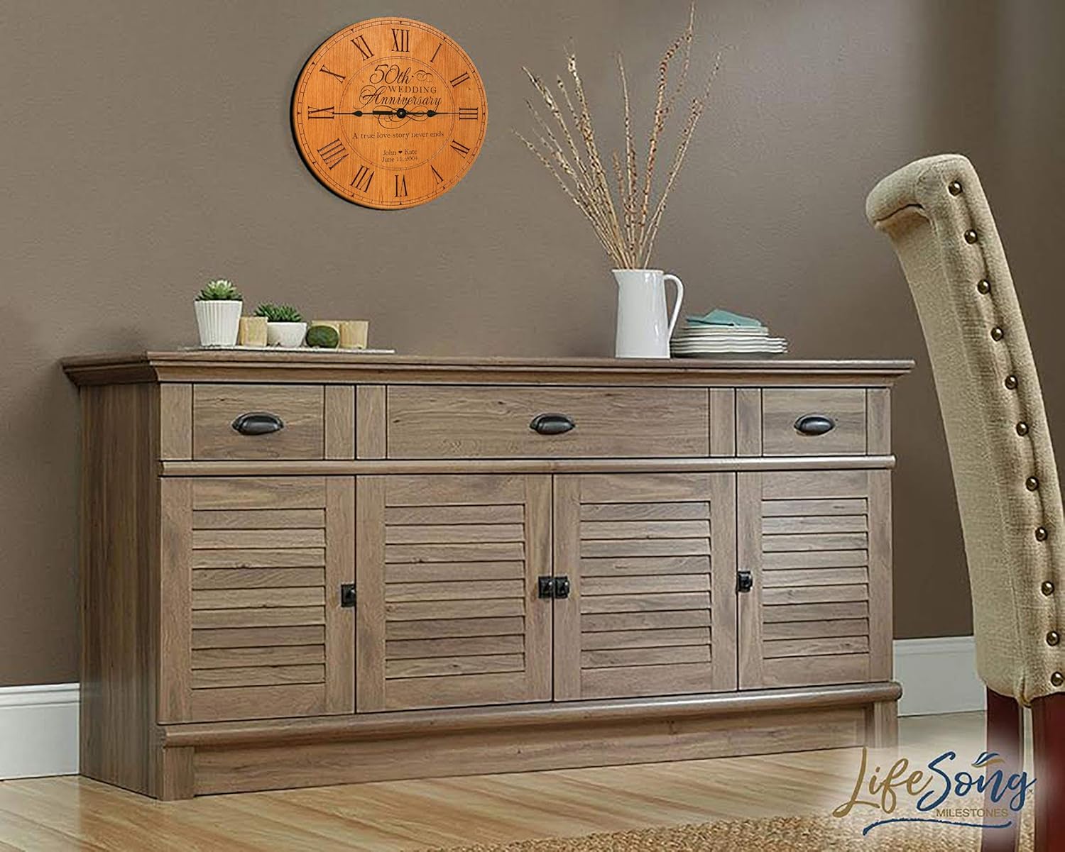 Personalized wedding anniversary clock shows off a keepsake wedding day memory, elegantly engraved with scripted bride and groom name and wedding date. Crafted in the USA for wall or tabletop display; clock 12" x 12"x 1.5". Quality gift for wedding or anniversary; decorator accent that is functional and inspiring. Personalization is included in the price of the clock and includes one line of script for the names and one line of print for the date.