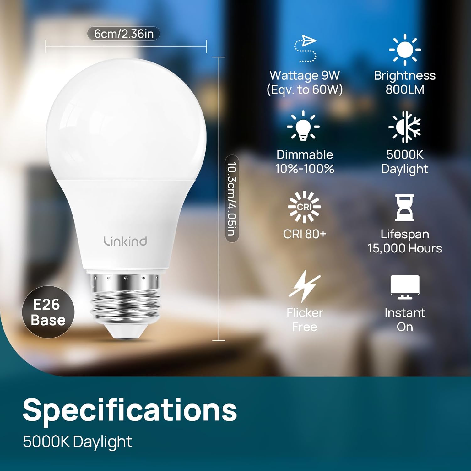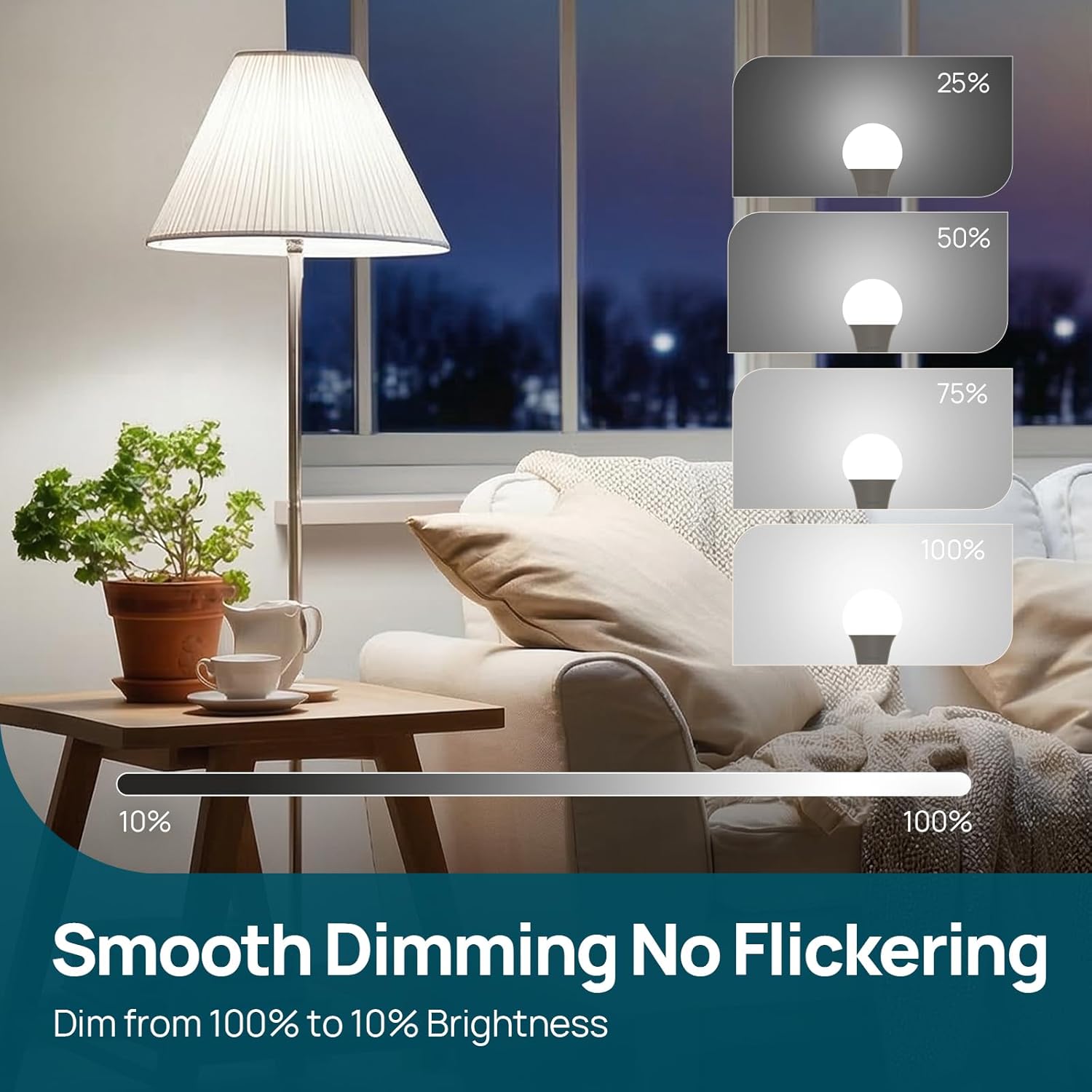 | Additional Features | Dimmable light bulbs (10%-100% dimming range), Eye-Friendly, Flicker-Free, Instant On, Long Lasting (15,000 hours lifespan) |
