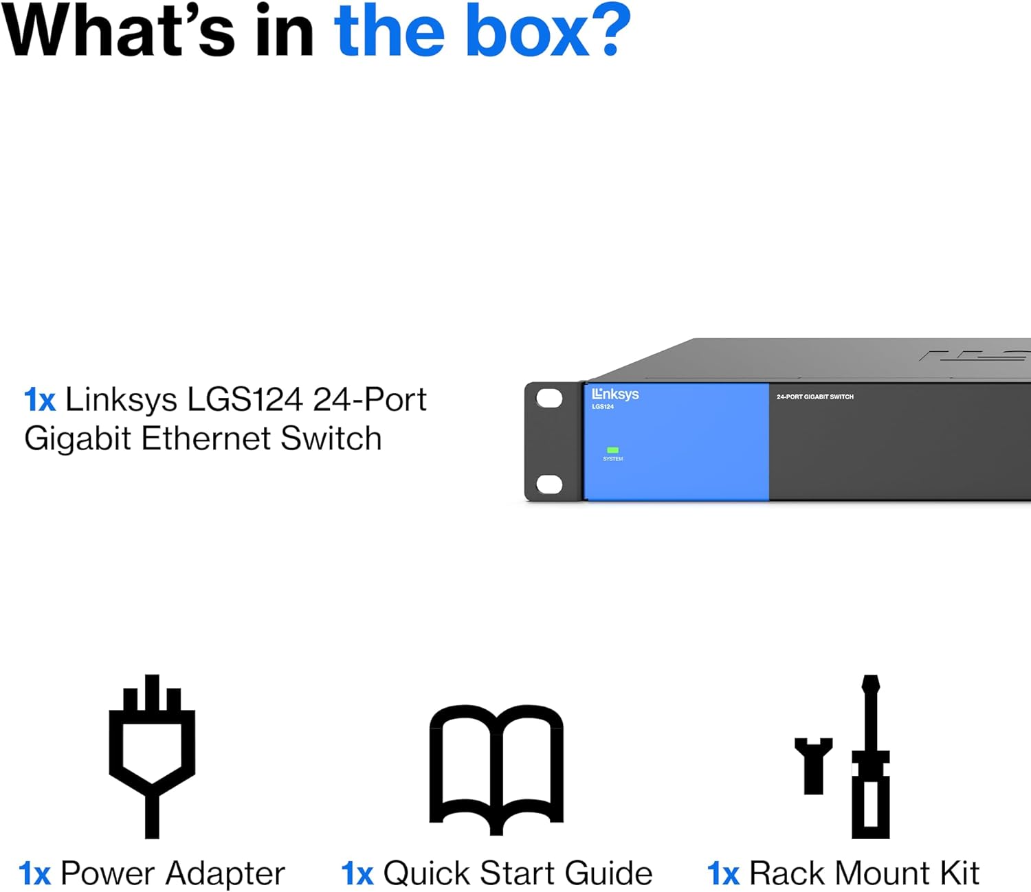 Linksys LGS124 24-Port Business Gigabit Switch A wireless network may not be the best option for your business for a variety of reasons, including unreliability, slow download speeds, privacy concerns, and your daily data transference. Upgrade the data paths of your local wired network to information superhighways with Gigabit switches at the desktop. Accelerate your performance and productivity when you send large files to network servers, drives, and printers at Gigabit speed. Plug-And-Play Convenience Linksys unmanaged switches offer a quick and easy solution to extend your office network with plug-and-play installation. Gigabit Performance The unmanaged switch offers Gigabit speeds to minimize transfer times and greatly enhance the ability to stream high-bandwidth files to connected devices without interference. Power Saving Features Power saving features include auto power-down to disable unused ports, smart power for short cable runs, and a port status switch to control LED lights.