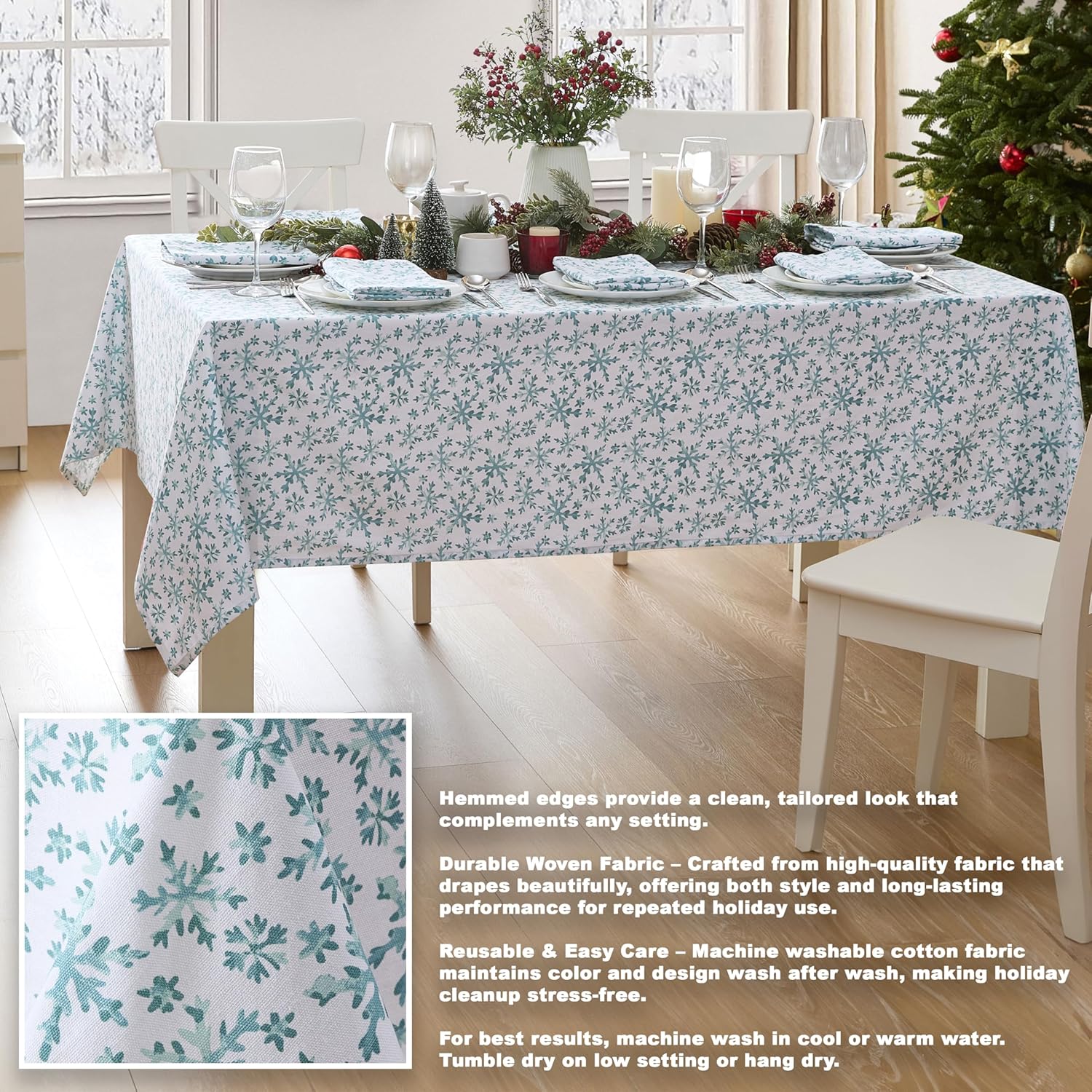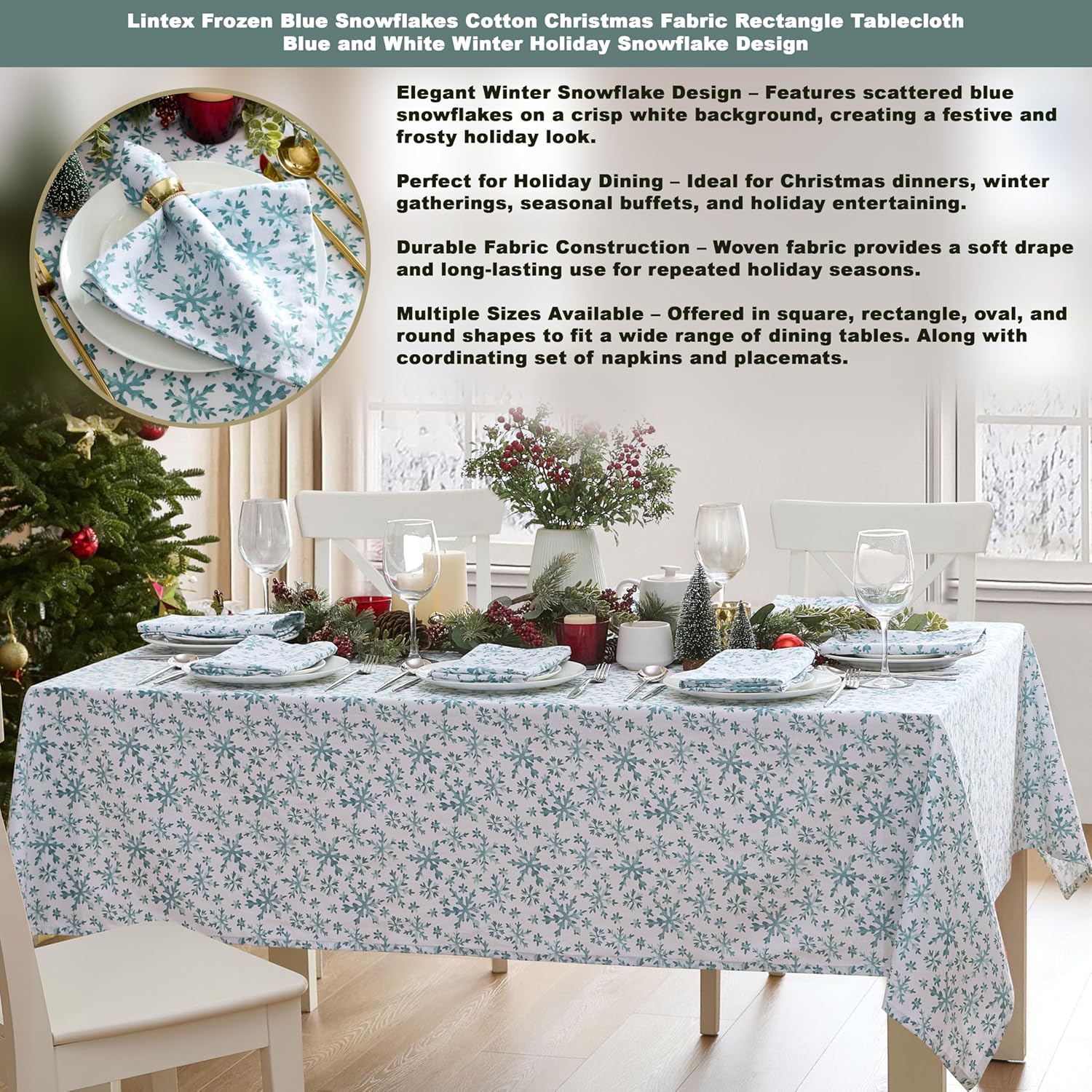 Create a serene winter wonderland in your dining space with the Lintex Frozen Blue Snowflakes Christmas Fabric Tablecloth. Crafted from soft and durable 100% cotton, this festive tablecloth features a repeating pattern of delicate blue snowflakes scattered across a crisp white background. Its clean and frosty design brings a touch of Nordic-inspired elegance to your Christmas and winter décor, making it ideal for holiday dinners, seasonal parties, or cozy winter meals at home. The tightly woven cotton fabric is both decorative and functional—machine washable and easy to care for, so you can enjoy its charm all season long.