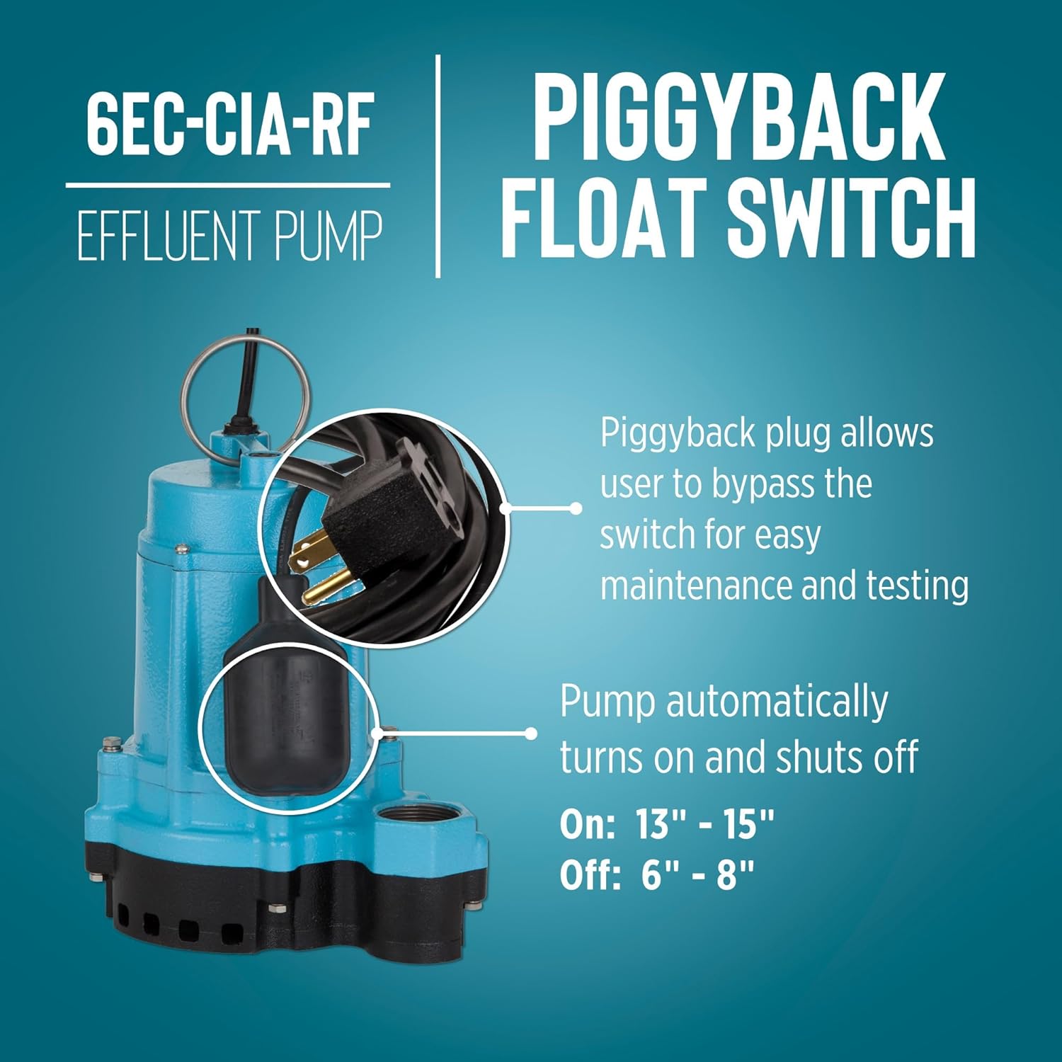 The Little Giant 506858 6EC-CIA-RF 1/3 hp, 3180 GPH pump is ideal for use as a sump, light effluent or emergency water transfer pump. This pump can handle up to 1/2" solids and has a 1.5" FNPT discharge. The polypropylene base helps prevent rust stains on floors when used as an emergency water transfer pump. This pump comes with a long 115-volt 20' cord suitable for standard outlets in North American homes. The piggyback tethered switch activates the pump when the water level reaches 13" to 15" and shuts off when the water level drops to between 6" and 8". The piggyback plug on the switch allows the switch to be overridden for service or maintenance.Features & Benefits:- 1/3 horsepower PSC motor- 1-1/2" FNPT discharge- 140 °F (60 °C) liquid temperature ratingPump selection guidelines:Application: effluent pumps can be used to transfer or remove clean water or liquid effluent with up to 1/2" semi-solids. It is not designed to pass raw sewage.Switch options (not all may be available): - Tethered switches rise/drop with the depth of the water. They require a minimum basin size of 18". The on/off levels can be adjusted easily.- Diaphragm switches take up less room than a traditional tethered switch and uses water pressure to turn the pump on/off. A breather tube is located on the plug which must be free of debris for it to operate properly. The on/off levels cannot be adjusted.- Snap-action switches take up less room that a traditional tethered switch. The float rises/lowers with the water level. The on/off level cannot be adjusted. Piggyback vs. integral (built-in):- A piggyback plug allows the switch to be overridden to pump below the off level. It is easily replaceable. - An integral switch is built into the pump. An integral switch cannot be overridden so it is not the best choice for emergency water removal.