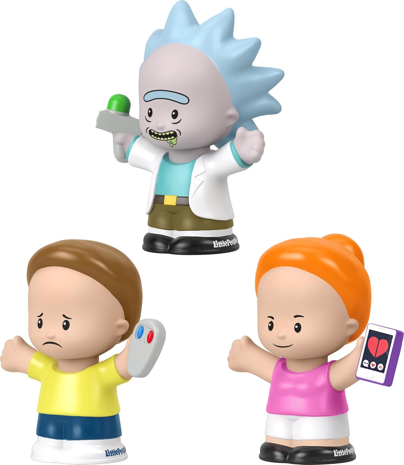 Where will you end up as you embark on wild and crazy, interdimensional adventures with this special edition Little People Collector Rick and Morty figure set from Fisher-Price Featuring 3 Little People figurines styled like Rick Sanchez, Morty Smith and Summer Smith, this collectable set comes in a decorative window box package styled with cool imagery from the Adult Swim animated series, as well as fun hidden details for fans to discover.
