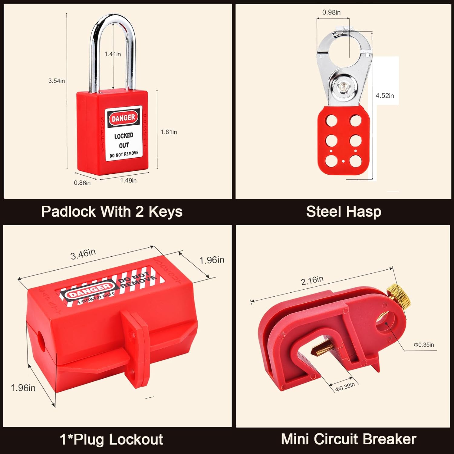 | Included Components | 2*Safety Padlocks,1*Nylon Hasp,2*Steel Hasp,8*Circuit Breaker Locks,1*Plug Lockout,6*Lockout Tag,5*Zip Ties,1*Marker,1*Lockout Tool Bag |