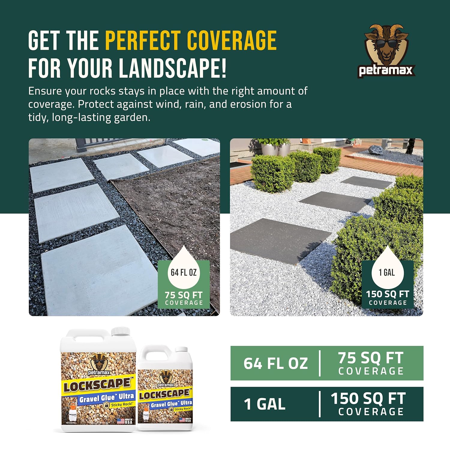 Create a cleaner and more stable landscape with this convenient outdoor bundle featuring the Lockscape Gravel Glue Ultra Rock Glue for Landscaping 1 Gallon and the Petratools HD101 1 Gallon Pump Sprayer. This landscaping kit is designed to help secure loose gravel, pebbles, and decorative stones in outdoor areas such as garden beds, walkways, and borders. The rock glue formula forms a durable bond that helps stabilize stones and reduce movement caused by rain, wind, foot traffic, or yard maintenance equipment. The included HD101 pump sprayer allows for easy and controlled application. With its 1-gallon translucent tank, measurement markings, 52-inch hose, and two interchangeable spray nozzles, you can apply rock glue evenly across landscaping surfaces while adjusting the spray pattern for different coverage needs. The adjustable nozzle provides a focused stream for precise application, while the fan tip nozzle offers wider coverage for larger areas. Built-in filters help prevent clogging, ensuring consistent spray performance throughout your landscaping project.