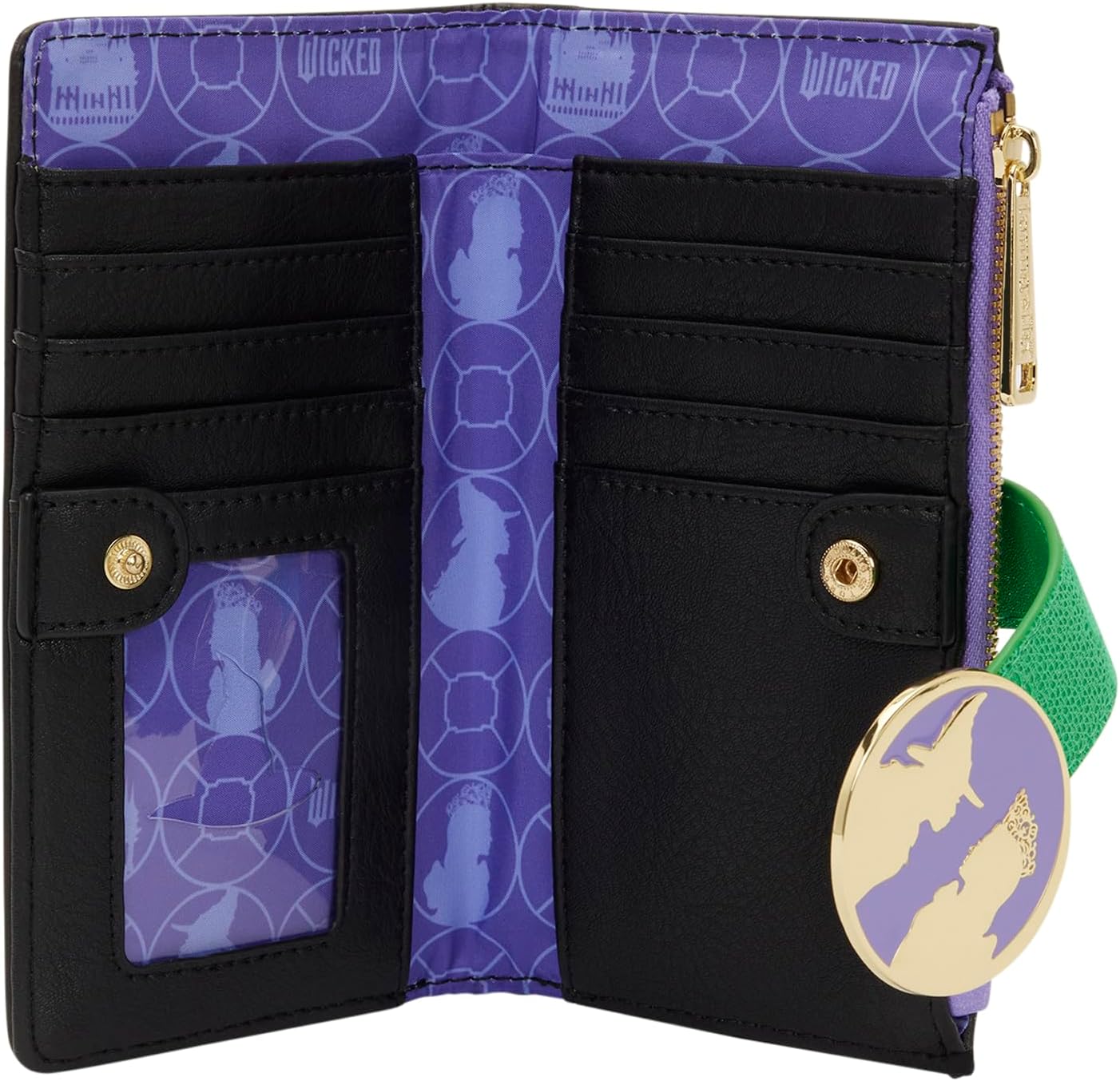 Take a piece of Oz with you every day! This wallet pays homage to both Glinda and Elphaba. On either side of the wallet, you'll find embroidered and embossed details that represent their characters. In the center is a 3D molded metal rivet featuring the silhouettes of Glinda and Elphaba. Inside, there are seven card slots and one clear ID slot. Show off your love for Wicked with your everyday style!