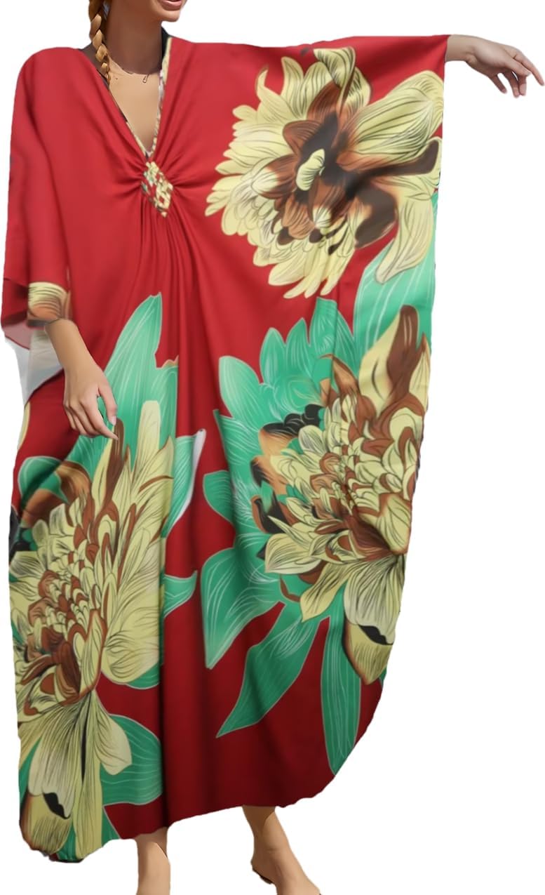 Product Description: Introducing LOUSEA's kaftan dress, the ultimate fusion of style and comfort. Crafted from soft, breathable fabric, this dress features a large flower print that catches the eye and complements any skin tone. The Vneck design offers a flattering fit, while the batwing sleeves add a touch of elegance and movement. Perfect for all seasons and occasions, this kaftan dress can be worn as a stylish cover-up for your one-piece bathingsuit or as a standalone piece for casual, daily wear. Its flowy silhouette and long length provide ample coverage and comfort, making it ideal for outdoor adventures, lounging at home, or casual outings. Embrace the beauty of simplicity with LOUSEA's kaftan dress. Its versatile design and vibrant print make it a must-have addition to your wardrobe. Order yours today and elevate your everyday style.