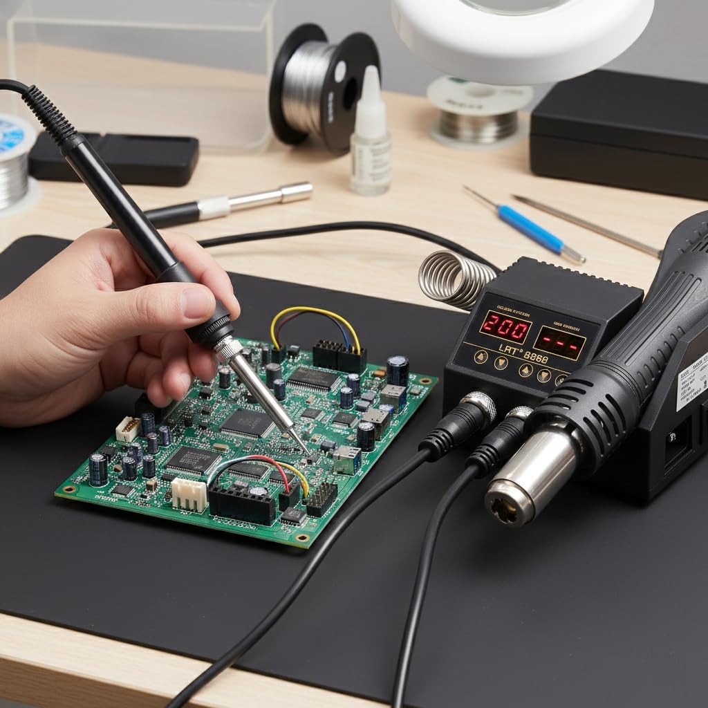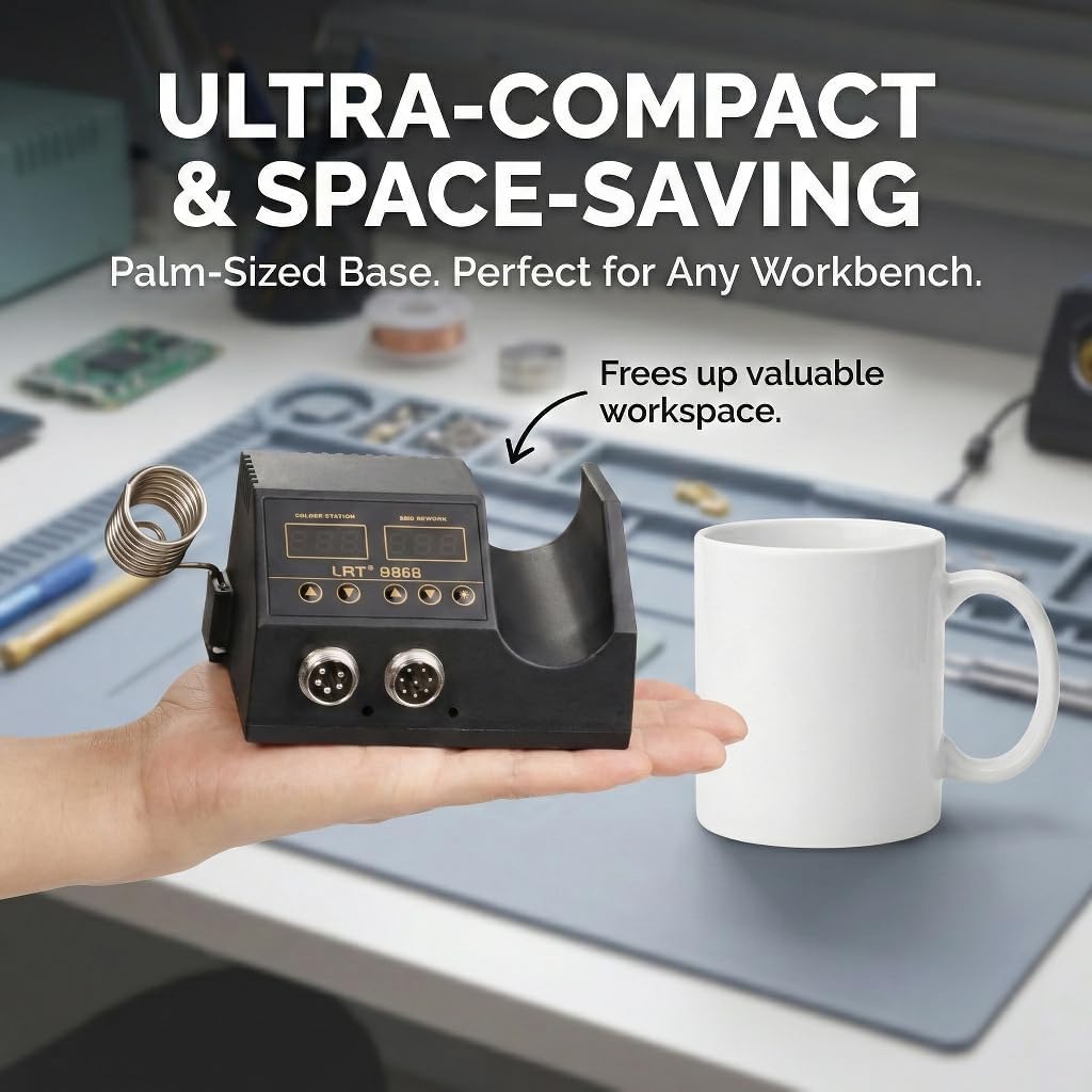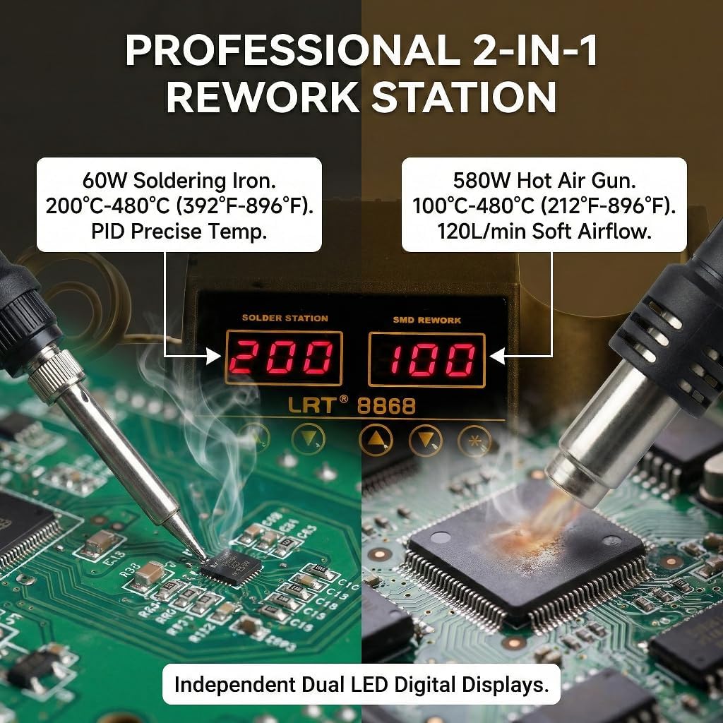LRT-8868: The Ultimate Compact Rework Solution for Pros & HobbyistsUpgrade your workstation with the LRT-8868 2-in-1 Rework Station. Whether you are a professional technician repairing mobile phones or a DIY enthusiast working on PCB projects, this station provides the power and precision you need in a palm-sized footprint.Why Choose the LRT-8868?Dual Functionality: Toggle between high-power soldering and precision hot air desoldering seamlessly.Intelligent Interface: Simple button controls with a bright red LED display for clear visibility even in low-light environments.Safety First: The side-mounted master power switch and heat-resistant materials ensure a safe working environment.🛠 Technical SpecificationsFeature Hot Air Rework Station Soldering IronPower Output 580W 60WTemp Range 100°C~480°C (212°F-896°F) 200°C~480°C (392°F-896°F)Airflow Max 120L/min N/ATemp Stability ±1°C ±1°CVoltage AC 110V-120V 60Hz (US Plug) AC 110V-120V 60HzWhat’s in the Box?1 x LRT-8868 2-in-1 Station Unit, 1 x Hot Air Gun, 1 x Soldering Iron, 3 x Hot Air Nozzles, 5 x Soldering Tips, 2 x Anti-static Tweezers, 1 x Solder Wick, 1 x Cleaning Sponge.
