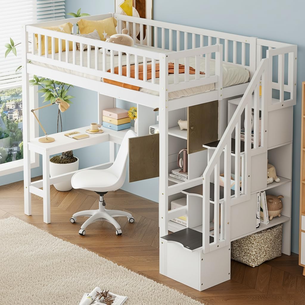 This multi-functional loft bed includes Shelves, Storage Staircase, Small Wardrobe and White LED Light. The loft bed can be used to store books or display decorations, providing you with a large storage space Material---Plywood,Solid Wood+MDF Numbers of Package---2 Package one:69 * 19 * 6.7 in. 83.78 lbs. Package two:80.4 * 12.5 * 7.2 in. 101.41 lbs. Color---White Origin---Vietnam Weight Capacity:Bed:300LB Overall Dimensions---95.8''L*42.2''W*65''H Net Weight---176lbs