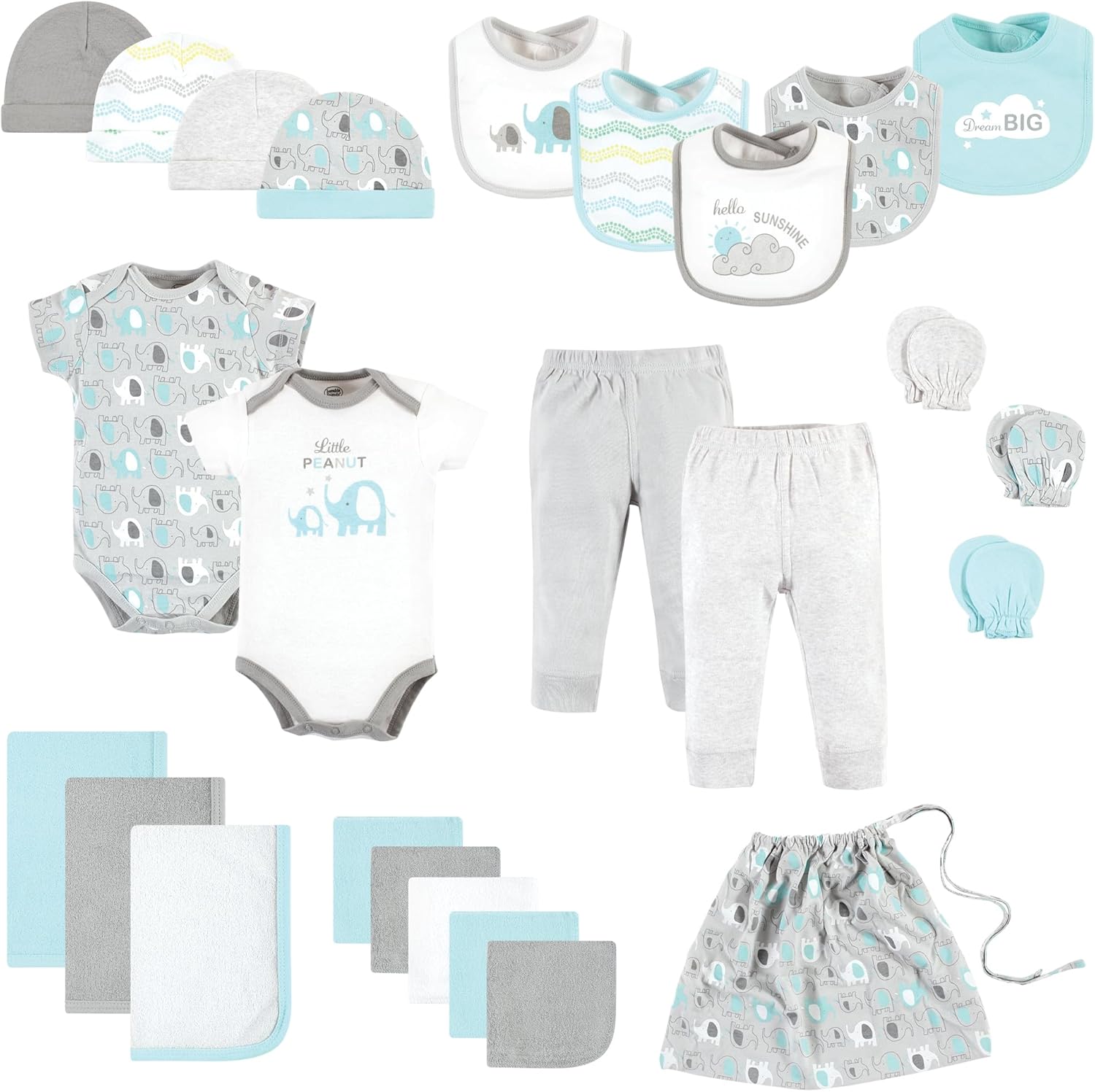 | Included Components | This product includes five bodysuits, tee tops, two pants, and twelve bibs. |
